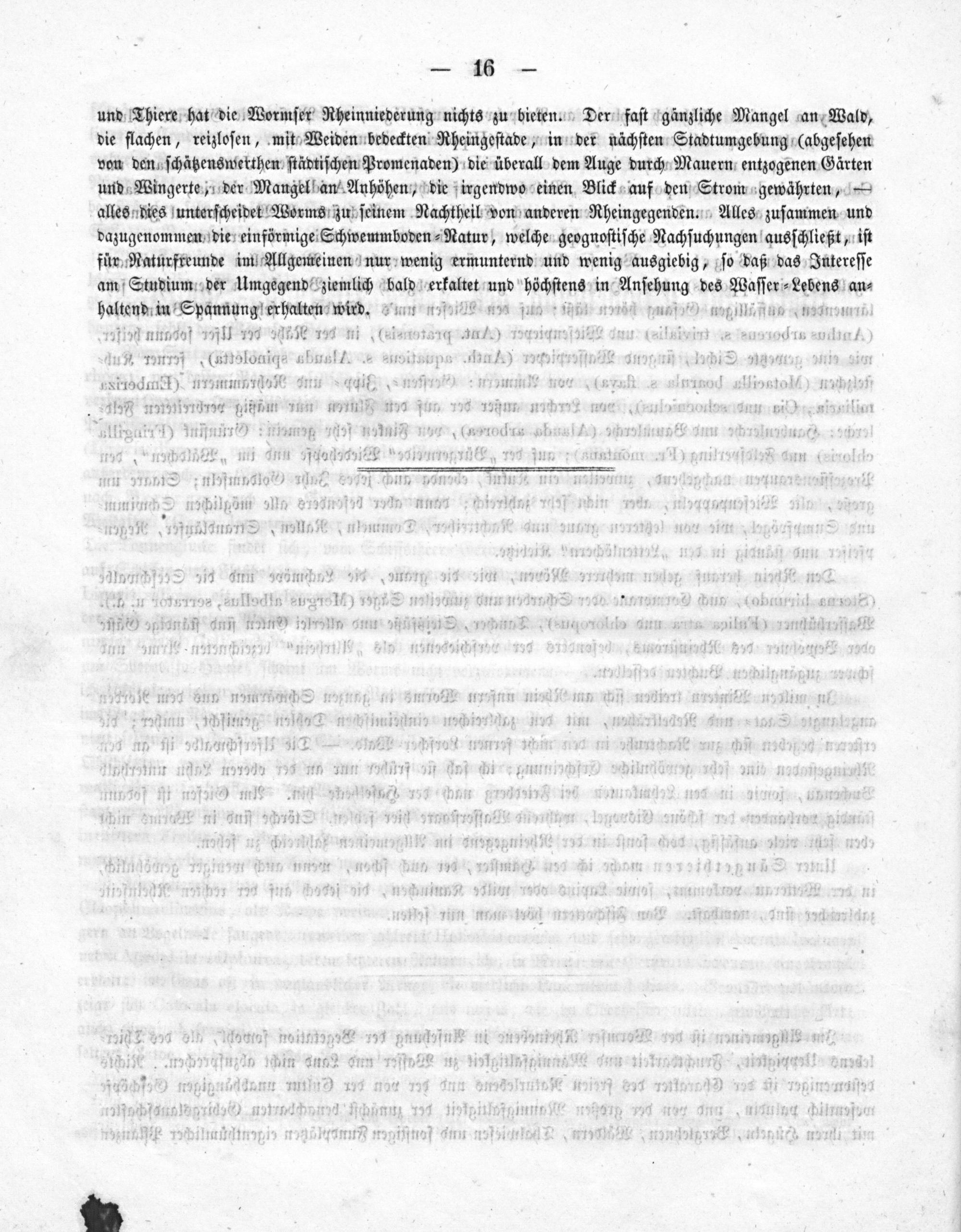 und Thiere hat die Wormſer Rheinniederung nichts zu bieten. Der faſt gänzliche Mangel an Wald, die flachen, reizloſen, mit Weiden bedeckten Rheingeſtade, in der nächſten Stadtumgebung(abgeſehen von den ſchätzenswerthen ſtädtiſchen Promenaden) die überall dem Auge durch Mauern entzogenen Gärten und Wingerte, der Mangelhan Anhöhen, die irgendwo einen Blick auf den Strom gewährten,— alles dies unterſcheidet Worms zu ſeinem Nachtheil von anderen Rheingegenden. Alles zuſammen und dazugenommen die einförmige Schwemmboden⸗Natur, welche geognoſtiſche Nachſuchungen ausſchließt, iſt für Naturfreunde im Allgemeinen nur wenig ermunternd und wenig ausgiebig, ſo daß das Intereſſe am Studium der Umgegend ziemlich bald zerfaltetn und d höchſtens in knſchuna des a aaſſeredtdens an⸗