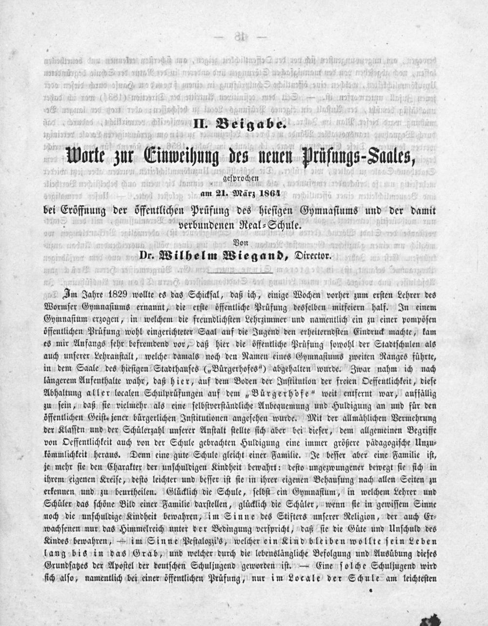 Im Jahre 1829 wollte es das Schickſal, daß ich, einige Wochen vorher zum erſten Lehrer des Wormſer Gymnaſiums ernannt, die erſte öffentliche Prüfung desſelben mitfeiern half. In einem Gymnaſium erzogen, in welchem die freundlichſten Lehrzimmer und namentlich ein zu einer pompöſen öffentlichen Prüfung wohl eingerichteter Saal auf die Jugend den erheiterndſten Eindruck machte, kam es mir Anfangs ſehr befremdend vor, daß hier die öffentliche Prüfung ſowohl der Stadtſchulen als auch unſerer Lehranſtalt, welche damals noch den Namen eines Gymnaſiums zweiten Ranges führte, in dem Saale des hieſigen Stadthauſes(„Bürgerhofes“) abgehalten wurde. Zwar nahm ich nach längerem Aufenthalte wahr, daß hier, auf dem Boden der Inſtitution der freien Oeffentlichkeit, dieſe Abhaltung aller localen Schulprüfungen auf dem„Buͤrgerhofe“ weit entfernt war, auffällig zu ſein, daß ſie vielmehr als eine ſelbſtverſtändliche Anbequemung und Huldigung an und für den öffentlichen Geiſt. jener bürgerlichen Inſtitutionen angeſehen wurde. Mit der allmählichen Vermehrung der Klaſſen und der Schülerzahl unſerer Anſtalt ſtellte ſich aber bei dieſer, dem allgemeinen Begriffe von Oeffentlichkeit auch von der Schule gebrachten Huldigung eine immer größere pädagogiſche Unzu⸗ kömmlichkeit heraus. Denn eine gute Schule gleicht einer Familie. Je beſſer aber eine Familie iſt, je mehr ſie den Charakter der unſchuldigen Kindheit bewahrt: deſto ungezwungener bewegt ſie ſich in ihrem eigenen Kreiſe, deſto leichter und beſſer iſt ſie in ihrer eigenen Behauſung nach allen Seiten zu erkennen und zu beurtheilen. Glücklich die Schule, ſelbſt ein Gymnaſium, in welchem Lehrer und Schüler das ſchöne Bild einer Familie darſtellen, glücklich die Schüler, wenn ſie in gewiſſem Sinne noch die unſchuldige Kindheit bewahren, im Sinne des Stifters unſerer Religion, der auch Er⸗ wachſenen nur das Himmelreich unter der Bedingung verſpricht, daß ſie die Güte und Unſchuld des Kindes bewahren,— im Sinne Peſtalozzi's, welcher ein Kind bleiben wollte ſein Leben lang bis in das Grab, und welcher durch die lebenslängliche Befolgung und Ausübung dieſes Grundſatzes der Apoſtel der deutſchen Schuljugend geworden iſt.— Eine ſolche Schuljugend wird ſich alſo, namentlich bei einer öffentlichen Prüfung, nur im Locale der Schule am leichteſten