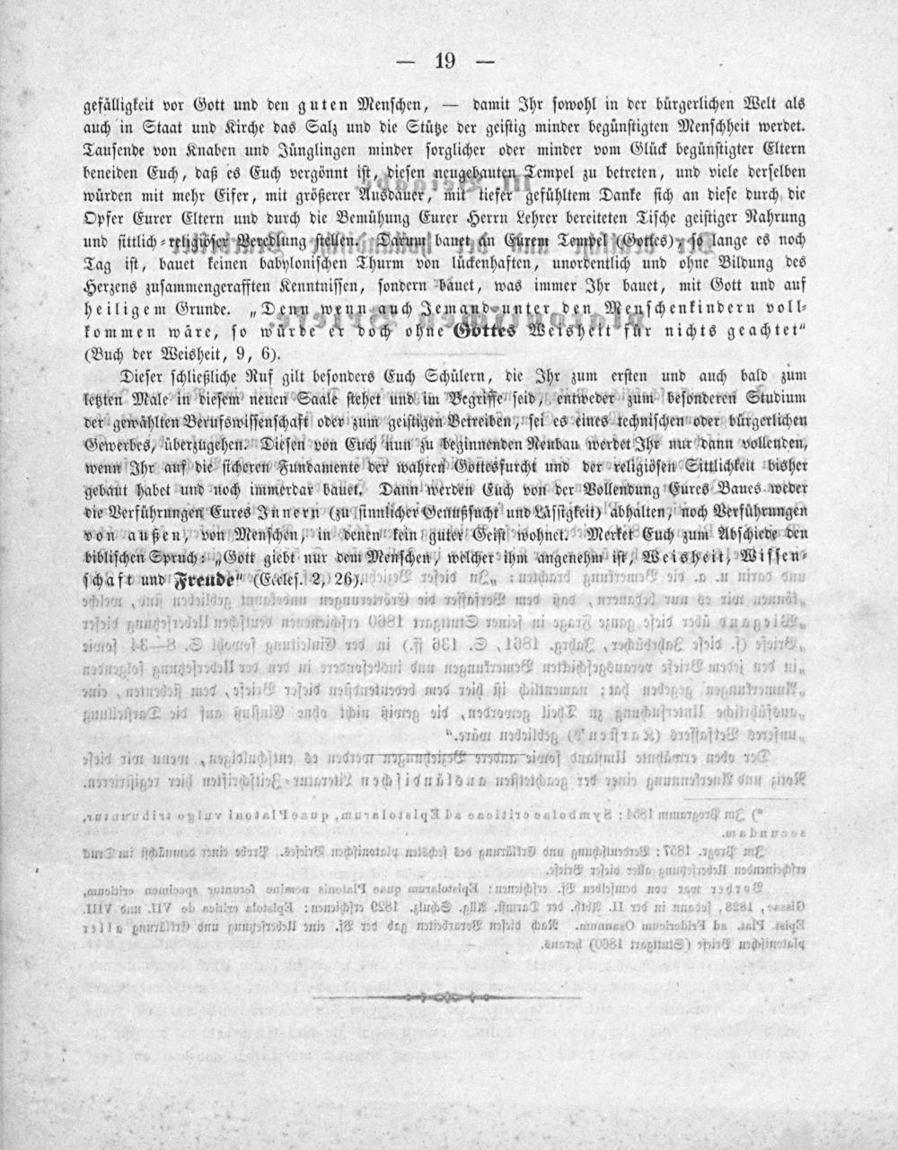 gefälligkeit vor Gott und den guten Menſchen,— damit Ihr ſowohl in der bürgerlichen Welt als auch in Staat und Kirche das Salz und die Stütze der geiſtig minder begünſtigten Menſchheit werdet. Tauſende von Knaben und Jünglingen minder ſorglicher oder minder vom Glück begünſtigter Eltern beneiden Euch, daß es Euch vergönnt iſt, dieſen neugehautem Tempel zu betreten, und viele derſelben würden mit mehr Eifer, mit größerer Ausdauer, mit tiefer gefühltem Danke ſich an dieſe durch die Opfer Eurer Eltern und durch die Bemühung Eurer Herrn Lehrer bereiteten Tiſche geiſtiger Nahrung und ſittlich⸗reljgibſer Vevedlung ſtellen⸗ Dgrun un bauft gn Curem Temel(Gotkes)7 ſes lange es noch Tag iſt, bauet keinen babyloniſchen Thurm ann lückenhaften, unordentlich und ohne Bildung des Herzens zuſammengerafften Kenntniſſen, ſondern bauet, was immer Ihr bauet, mit Gott und auf heiligem Grunde.„Den w ung auch Jem daunter, den AAlbenkindern voll⸗ kommen wäre, ſo würde e doch ohne ies K B kshett füͤr nichts geachtet“ (Buch der Weisheit, 9, 6).
