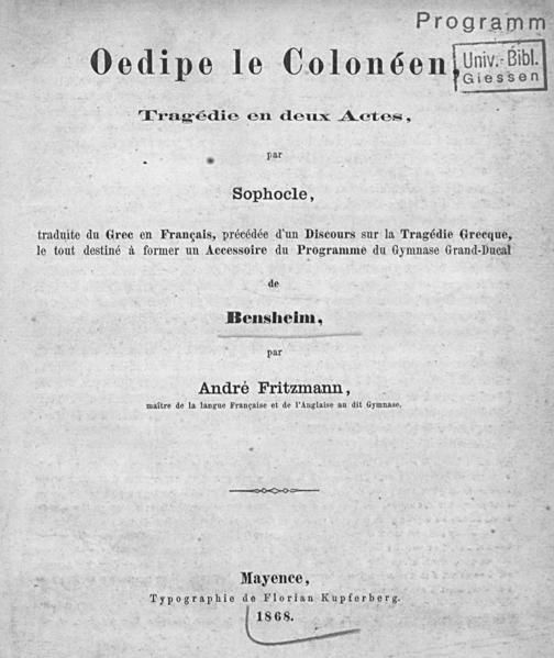 traduite du Grec en Français, précédée d'un Discours sur la Tragédie Grecque, le tout destiné à former un Accessoire du Programme du Gymnase Grand-Ducal