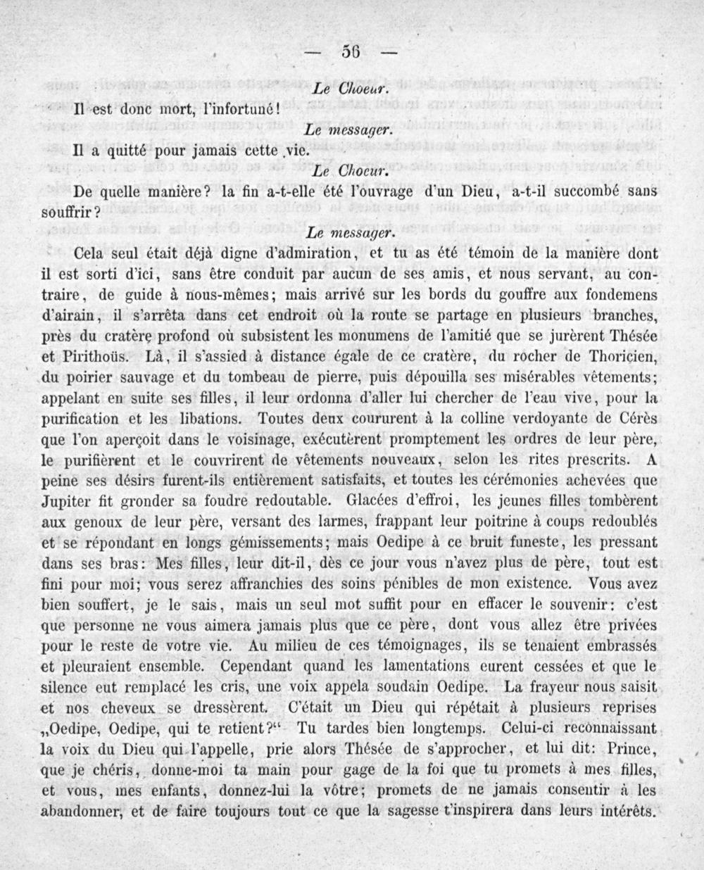 Le Choeur. Il est donc mort, l'infortuné! Le messager. Il a quitté pour jamais cette vie. Le Choeur. De quelle manière? la fin a-t-elle été l'ouvrage d'un Dieu, a-t-il succombé sans souffrir? Le messager. 1 Cela seul était déjà digne d'admiration, et tu as été témoin de la manière dont il est sorti d'ici, sans étre conduit par aucun de ses amis, et nous servant, au con- traire, de guide à nous-mêmes; mais arrivé sur les bords du gouffre aux fondemens d'airain, il s'arrèéta dans cet endroit où la route se partage en plusieurs branches, près du cratère profond où subsistent les monumens de l'amitié que se jurèrent Thésée et Pirithoüs. Là, il s'assied à distance égale de ce cratère, du rocher de Thoricien, du poirier sauvage et du tombeau de pierre, puis dépouilla ses misérables vêtements; appelant en suite ses filles, il leur ordonna d'aller lui chercher de l'eau vive, pour la purification et les libations. Toutes deux coururent à la colline verdoyante de Cérès que l'on aperçoit dans le voisinage, exécutèrent promptement les ordres de leur père, le purifièrent et le couvrirent de vèêtements nouveaux, selon les rites prescrits. A peine ses désirs furent-ils entièrement satisfaits, et toutes les cérémonies achevées que Jupiter fit gronder sa foudre redoutable. Glacées d'effroi, les jeunes filles tombèrent aux genoux de leur père, versant des larmes, frappant leur poitrine à coups redoublés et se répondant en longs gémissements; mais Oedipe à ce bruit funeste, les pressant dans ses bras: Mes filles, leur dit-il, dès ce jour vous n'avez plus de père, tout est fini pour moi; vous serez affranchies des soins pénibles de mon existence. Vous avez bien souffert, je le sais, mais un seul mot suffit pour en effacer le souvenir: c'est que personne ne vous aimera jamais plus que ce père, dont vous allez éêtre privées pour le reste de votre vie. Au milieu de ces témoignages, ils se tenaient embrassés et pleuraient ensemble. Cependant quand les lamentations eurent cessées et que le silence eut remplacé les cris, une voix appela soudain Oedipe. La frayeur nous saisit, et nos cheveux se dressèrent. C'était un Dieu qui répétait à plusieurs reprises „Oedipe, Oedipe, qui te retient?“ Tu tardes bien longtemps. Celui-ci reconnaissant la voix du Dieu qui l'appelle, prie alors Thésée de s'approcher, et lui dit: Prince, que je chéris, donne-moi ta main pour gage de la foi que tu promets à mes filles, et vous, mes enfants, donnez-lui la vôtre; promets de ne jamais consentir à les abandonner, et de faire toujours tout ce que la sagesse t'inspirera dans leurs intéréts.