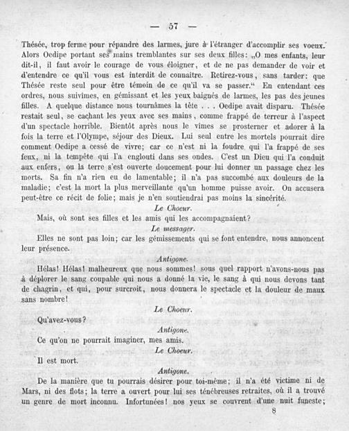 Thésée, trop ferme pour répandre des larmes, jure à l'étranger d'accomplir ses voeux. Alors Oedipe portant ses mains tremblantes sur ses deux filles:„O mes enfants, leur dit-il, il faut avoir le courage de vous éloigner, et de ne pas demander de voir et d'entendre ce qu'il vous est interdit de connaitre. Retirez-vous, sans tarder: que Thésée reste seul pour étre témoin de ce qu'il va se passer.“ En entendant ces ordres, nous suivimes, en gémissant et les yeux baignés de larmes, les pas des jeunes filles. A quelque distance nous tournàmes la tète... Oedipe avait disparu. Thésée restait seul, se cachant les yeux avec ses mains, comme frappé de terreur à l'aspect d'un spectacle horrible. Bientéòt après nous le vimes se prosterner et adorer à la fois la terre et l'Olympe, séjour des Dieux. Lui seul entre les mortels pourrait dire comment Oedipe a cessé de vivre; car ce n'est ni la foudre qui l'a frappé de ses feux, ni la tempéète qui l'a englouti dans ses ondes. C'est un Dieu qui Pa conduit aux enfers, ou la terre s'est ouverte doucement pour lui donner un passage chez les morts. Sa fin n'a rien eu de lamentable; il n'a pas succombé aux douleurs de la maladie; c'est la mort la plus merveillante qu'un homme puisse avoir. On accusera peut-être ce récit de folie; mais je n'en soutiendrai pas moins la sincérité. Le Choeur. 4 Mais, où sont ses filles et les amis qui les accompagnaient? Le messager. Elles ne sont pas loin; car les gémissements qui se font entendre, nous annoncent leur présence. Antigone. Hélas! Hélas! malheureux que nous sommes! sous quel rapport n n'avons-nous pas à déplorer le sang coupable qui nous a donné la vie, le sang à qui nous devons tant de chagrin, et qui, pour surcroit, nous donnera le spectacle et la douleur de maux sans nombre! ¹ Le Choeur. Qrre⸗ Pons 2