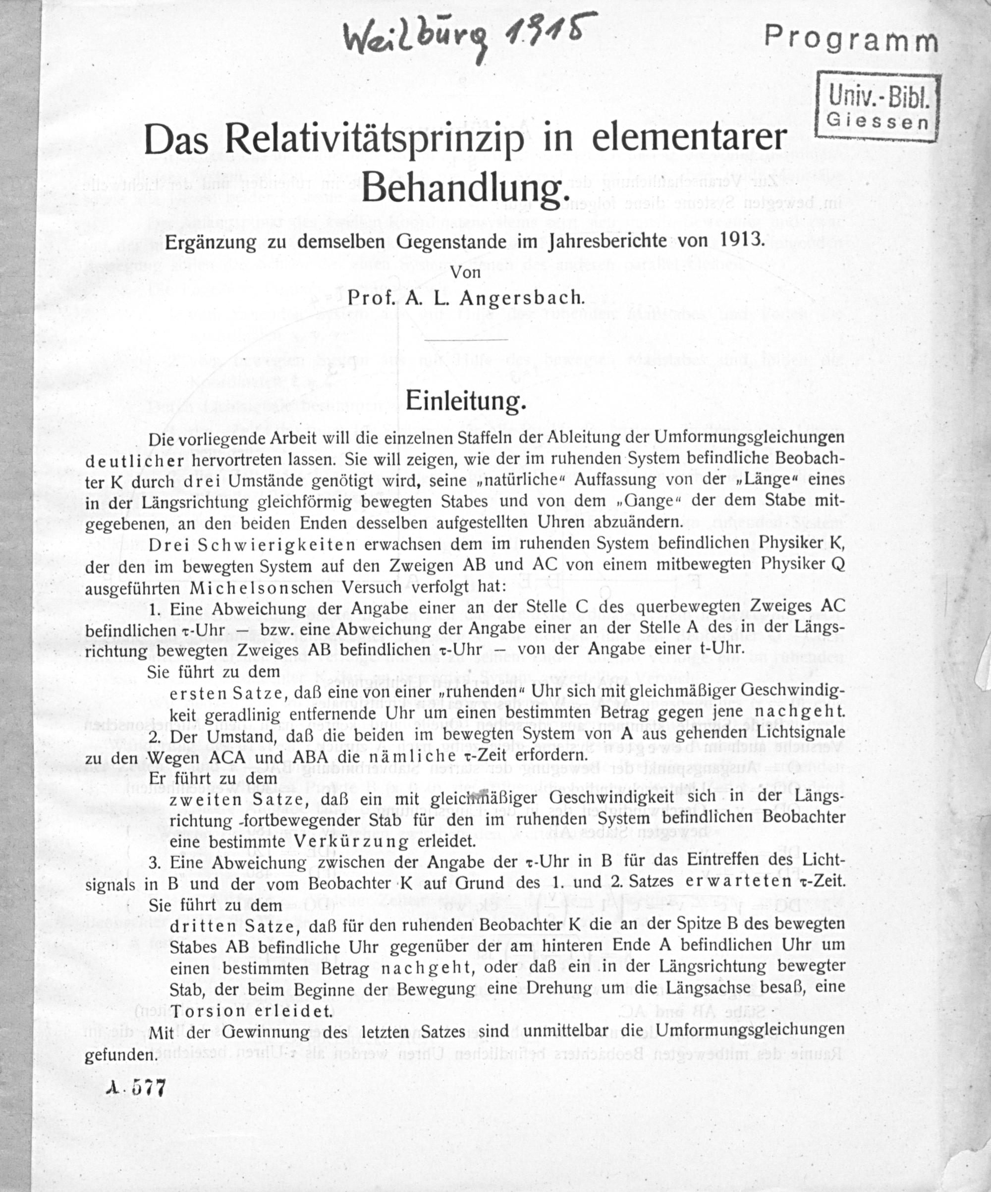 Die vorliegende Arbeit will die einzelnen Staffeln der Ableitung der Umformungsgleichungen deutlicher hervortreten lassen. Sie will zeigen, wie der im ruhenden System befindliche Beobach- ter K durch drei Umstände genötigt wird, seine„natürliche“ Auffassung von der„Länge“ eines in der Längsrichtung gleichförmig bewegten Stabes und von dem„Oange“ der dem Stabe mit-