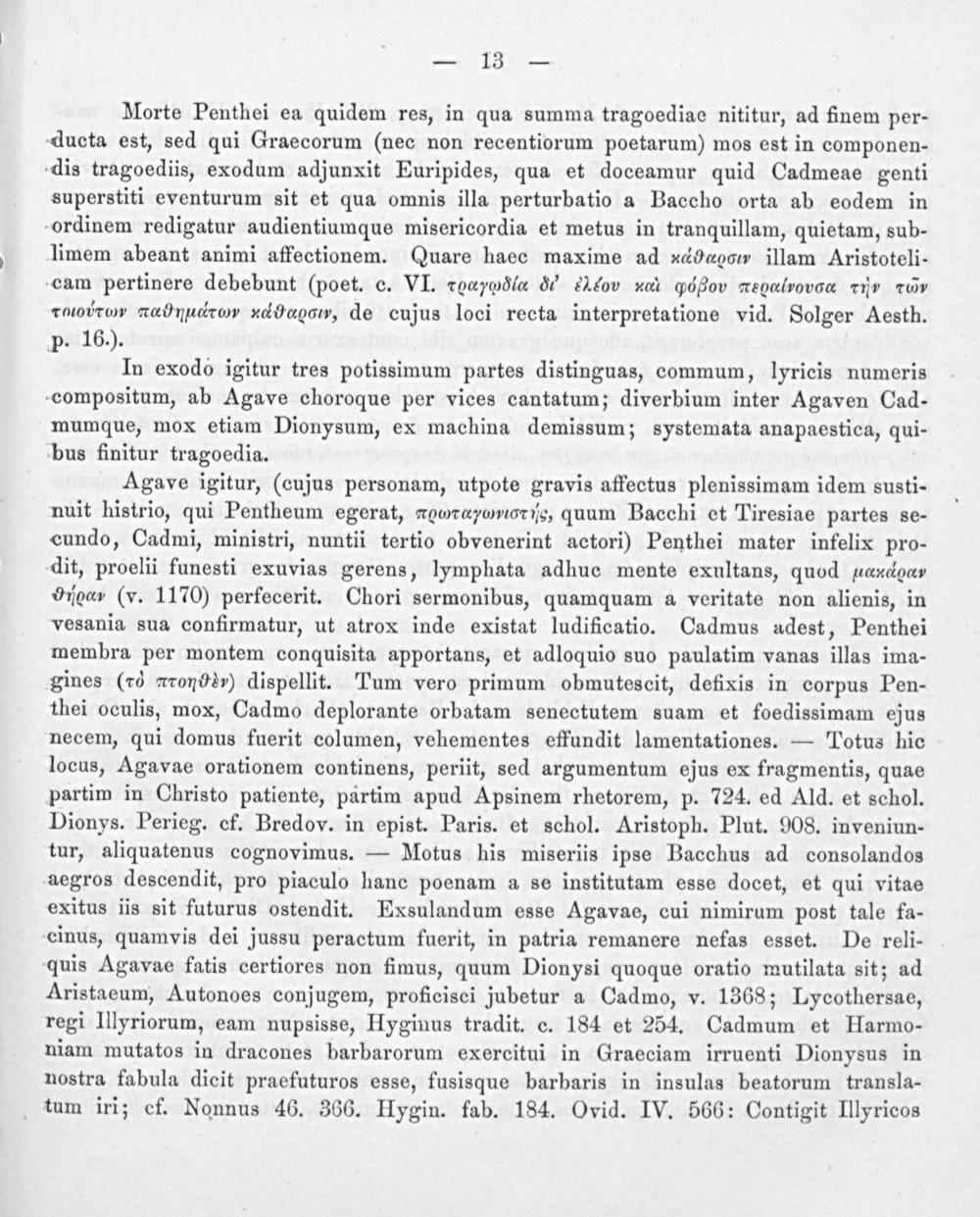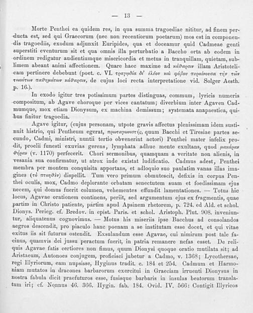 Morte Penthei ea quidem res, in qua summa tragoediae nititur, ad finem per- ducta est, sed qui Graecorum(nec non recentiorum poetarum) mos est in componen- dis tragoediis, exodum adjunxit Euripides, qua et doceamur quid Cadmeae genti superstiti eventurum sit et qua omnis illa perturbatio a Baccho orta ab eodem in ordinem redigatur audientiumque misericordia et metus in tranquillam, quietam, sub- limem abeant animi affectionem. Quare haec maxime ad ½dòαοαν illam Aristoteli- cam pertinere debebunt(poet. c. VI. rοαmQ, ο³αάά§ι εμ‿ε‿ο ‿—ον εοαHovda Ti 10„ roεοευνqπσε ναμαει εἀƷναρςν, de cujus loci recta interpretatione vid. Solger Aesth. p. 16.).
