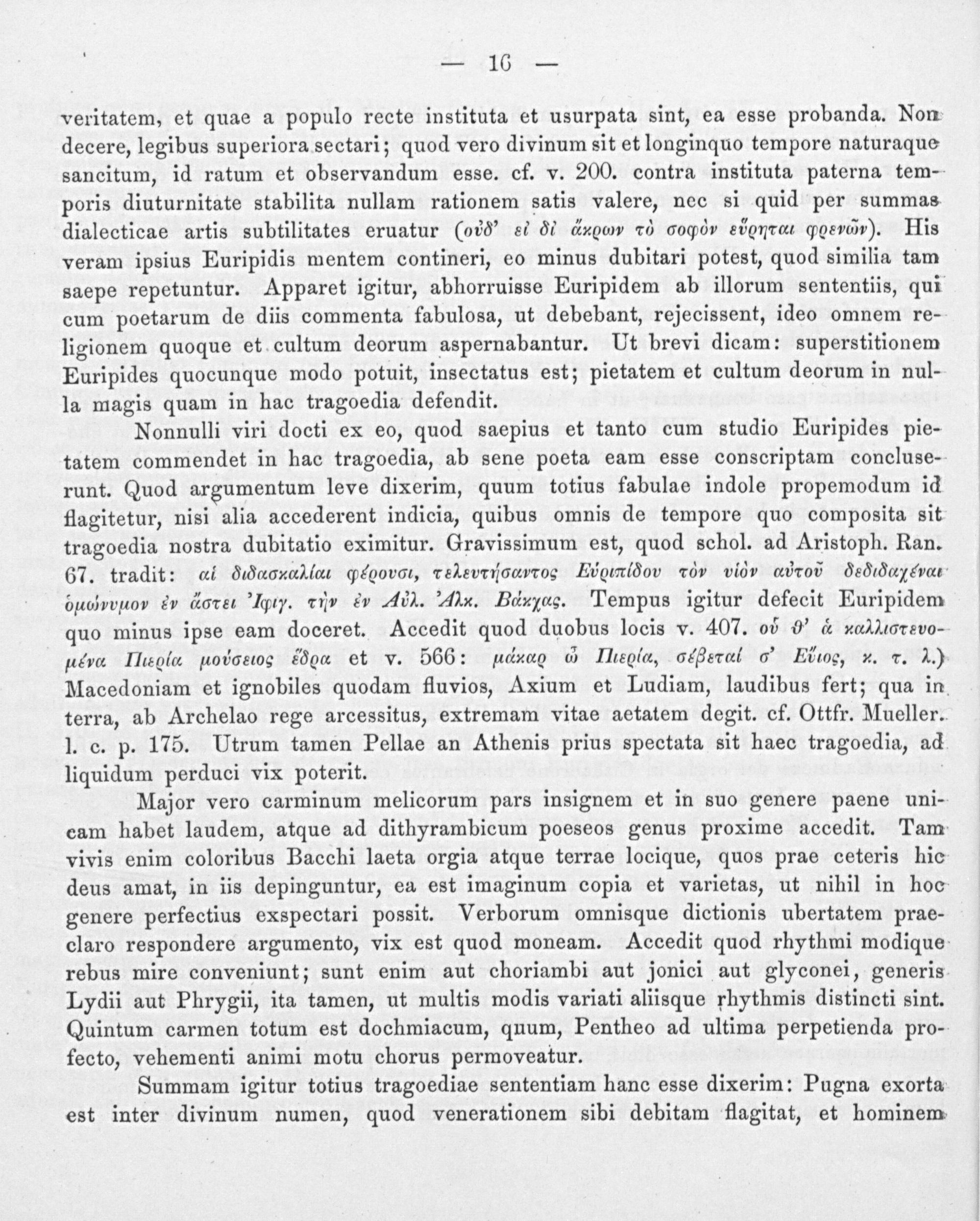 veritatem, et quae a populo recte instituta et usurpata sint, ea esse probanda. Non decere, legibus superiora sectari; quod vero divinum sit et longinquo tempore naturaque sancitum, id ratum et observandum esse. cf. v. 200. contra instituta paterna tem- poris diuturnitate stabilita nullam rationem satis valere, nec si quid per summas dialecticae artis subtilitates eruatur(ouo' i di dνοασ τ ασπσν εεορνναισαι σενιινν). His veram ipsius Euripidis mentem contineri, co minus dubitari potest, quod similia tam saepe repetuntur. Apparet igitur, abhorruisse Euripidem ab illorum sententiis, qui cum poetarum de düs commenta fabulosa, ut debebant, rejecissent, ideo omnem re- ligionem quoque et cultum deorum aspernabantur. Ut brevi dicam: superstitionem Euripides quocunque modo potuit, insectatus est; pietatem et cultum deorum in nul- la magis quam in hac tragoedia defendit.