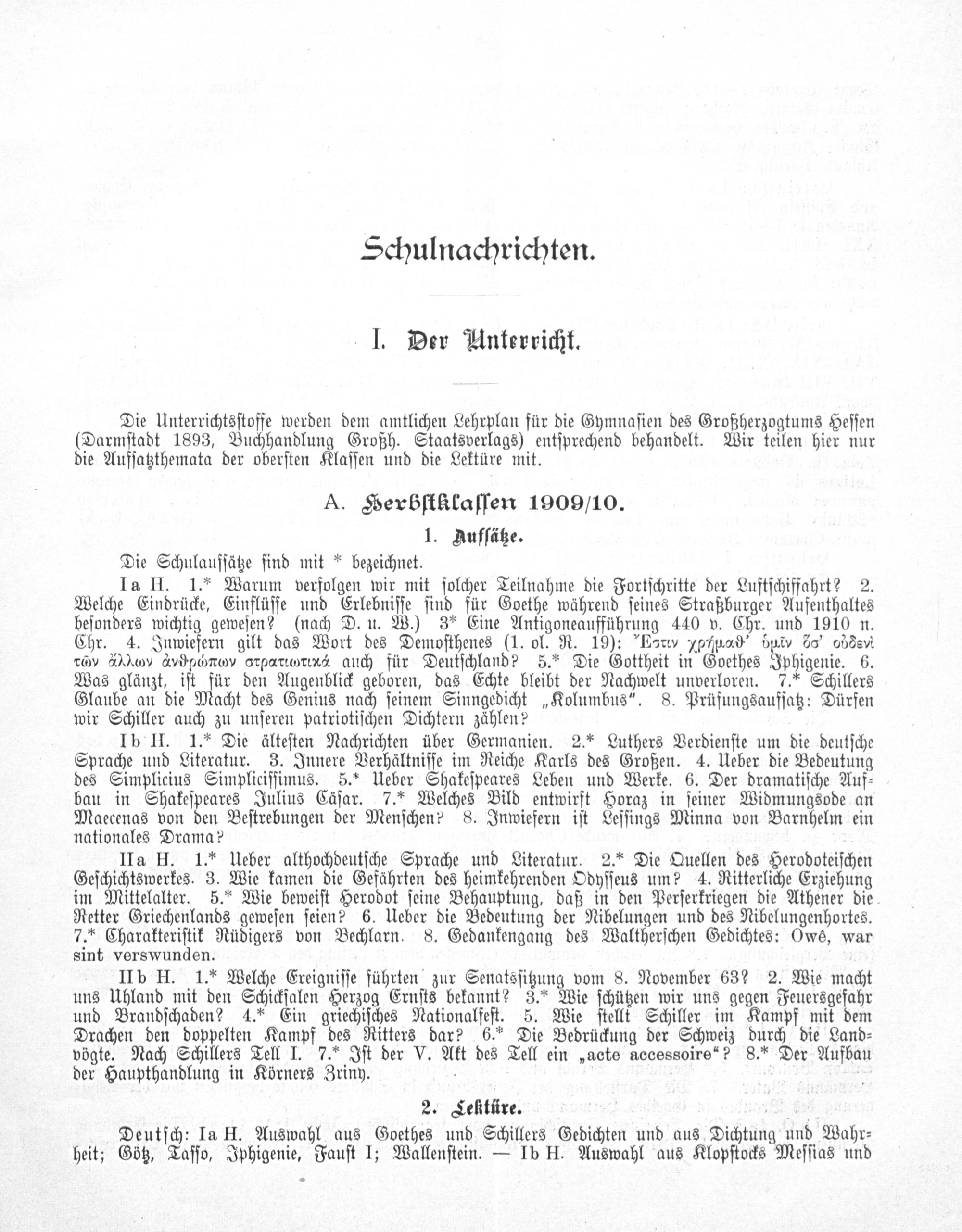 Ia II. 1.“ Warum verfolgen wir mit ſolcher Teilnahme die Fortſchritte der Luftſchiffahrt? 2. Welche Eindrücke, Einflüſſe und Erlebniſſe ſind für Goethe während ſeines Straßburger Aufenthaltes beſonders wichtig geweſen?(nach D. u. W.) 3* Eine Antigoneaufführung 440 v. Chr. und 1910 n. Chr. 4. Inwiefern gilt das Wort des Demoſthenes(1. ol. R. 19):*Eariy PT.d“ dud 50' 05Sew T6y ³NXGy AydèGy erparttiné auch für Deutſchland? 5.“ Die Gottheit in Goethes Iphigenie 6. Was glänzt, iſt für den Augenblick geboren, das Echte bleibt der Nachwelt unverloren. 7.* Schillers Glaube an die Macht des Genius nach ſeinem Sinngedicht„Kolumbus“. 8. Prüfungsauſſatz: Dürfen wir Schiller auch zu unſeren patriotiſchen Dichtern zählen?