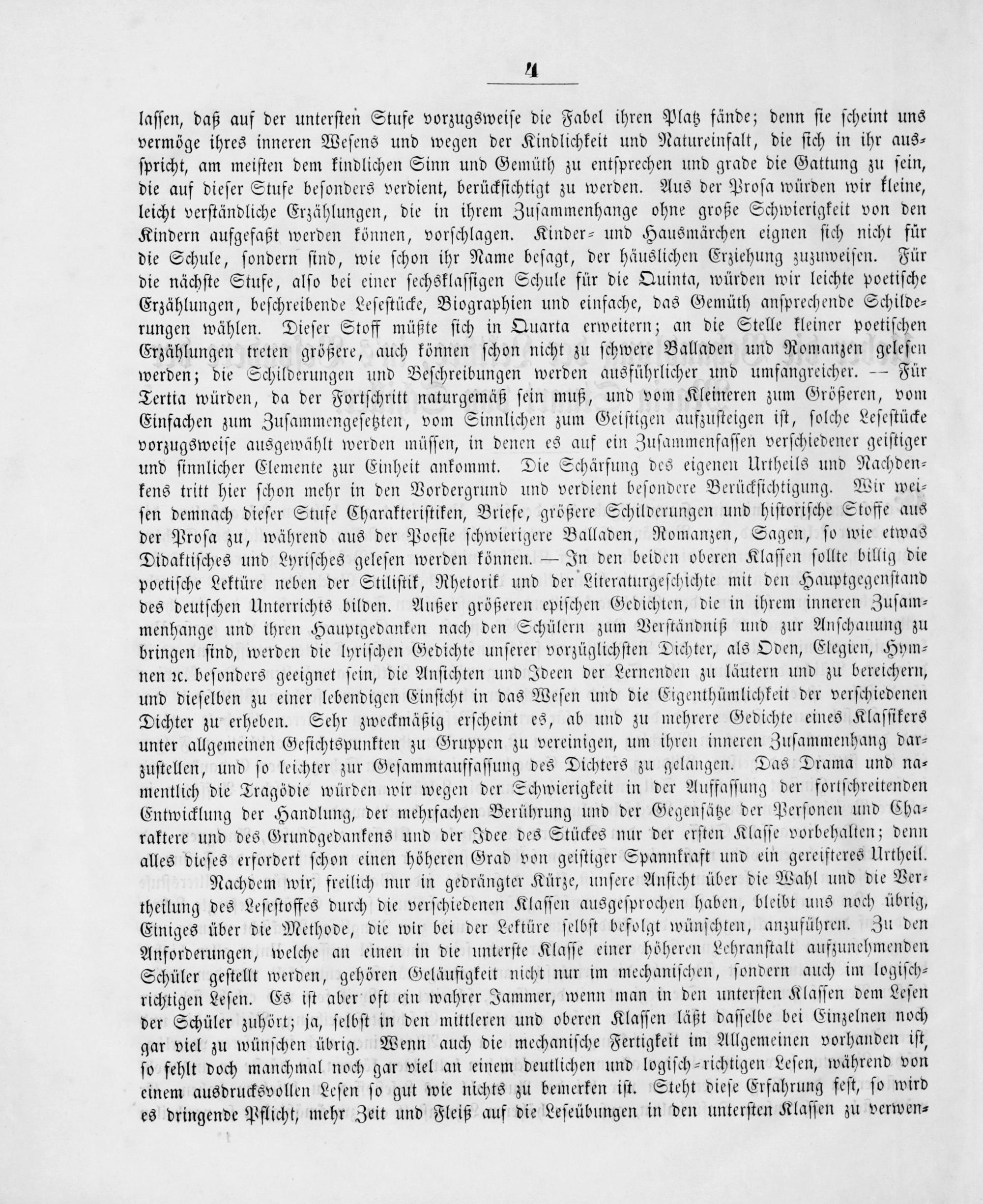 laſſen, daß auf der unterſten Stufe vorzugsweiſe die Fabel ihren Platz fände; denn ſie ſcheint uns vermöge ihres inneren Weſens und wegen der Kindlichkeit und Natureinfalt, die ſich in ihr aus⸗ ſpricht, am meiſten dem kindlichen Sinn und Gemüth zu entſprechen und grade die Gattung zu ſein, die auf dieſer Stufe beſonders verdient, berückſichtigt zu werden. Aus der Proſa würden wir kleine, leicht verſtändliche Erzählungen, die in ihrem Zuſammenhange ohne große Schwierigkeit von den Kindern aufgefaßt werden können, vorſchlagen. Kinder- und Hausmärchen eignen ſich nicht für die Schule, ſondern ſind, wie ſchon ihr Name beſagt, der häuslichen Erziehung zuzuweiſen. Für die nächſte Stufe, alſo bei einer ſechsklaſſigen Schule für die Quinta, würden wir leichte poetiſche Erzählungen, beſchreibende Leſeſtücke, Biographien und einfache, das Gemüth anſprechende Schilde⸗ rungen wählen. Dieſer Stoff müßte ſich in Quarta erweitern; an die Stelle kleiner poetiſchen Erzählungen treten größere, auch können ſchon nicht zu ſchwere Balladen und Romanzen geleſen werden; die Schilderungen und Beſchreibungen werden ausführlicher und umfangreicher.— Für Tertia würden, da der Fortſchritt naturgemäß ſein muß, und vom Kleineren zum Größeren, vom Einfachen zum Zuſammengeſetzten, vom Sinnlichen zum Geiſtigen außzuſteigen iſt, ſolche Leſeſtücke vorzugsweiſe ausgewählt werden müſſen, in denen es auf ein Zuſammenfaſſen verſchiedener geiſtiger und ſinnlicher Clemente zur Einheit ankommt. Die Schärfung des eigenen Urtheils und Nachden— kens tritt hier ſchon mehr in den Vordergrund und verdient beſondere Berückſichtigung. Wir wei⸗ ſen demnach dieſer Stufe Charakteriſtiken, Briefe, größere Schilderungen und hiſtoriſche Stoffe aus der Proſa zu, während aus der Poeſie ſchwierigere Balladen, Romanzen, Sagen, ſo wie etwas Didaktiſches und Lyriſches geleſen werden können.— In den beiden oberen Klaſſen ſollte billig die poetiſche Lektüre neben der Stiliſtik, Rhetorik und der Literaturgeſchichte mit den Hauptgegenſtand des deutſchen Unterrichts bilden. Außer größeren epiſchen Gedichten, die in ihrem inneren Zuſam⸗ menhange und ihren Hauptgedanken nach den Schülern zum Verſtändniß und zur Anſchauung zu bringen ſind, werden die lyriſchen Gedichte unſerer vorzüglichſten Dichter, als Oden, Elegien, Hym⸗ nen ꝛc. beſonders geeignet ſein, die Anſichten und Ideen der Lernenden zu läutern und zu bereichern, und dieſelben zu einer lebendigen Einſicht in das Weſen und die Eigenthümlichkeit der verſchiedenen Dichter zu erheben. Sehr zweckmäßig erſcheint es, ab und zu mehrere Gedichte eines Klaſſikers unter allgemeinen Geſichtspunkten zu Gruppen zu vereinigen, um ihren inneren Zuſammenhang dar— zuſtellen, und ſo leichter zur Geſammtauffaſſung des Dichters zu gelangen. Das Drama und na⸗ mentlich die Tragödie würden wir wegen der Schwierigkeit in der Auffaſſung der fortſchreitenden Entwicklung der Handlung, der mehrfachen Berührung und der Gegenſätze der Perſonen und Cha⸗ raktere und des Grundgedankens und der Idee des Stückes nur der erſten Klaſſe vorbehalten; denn alles dieſes erfordert ſchon einen höheren Grad von geiſtiger Spannkraft und ein gereifteres Urtheil.