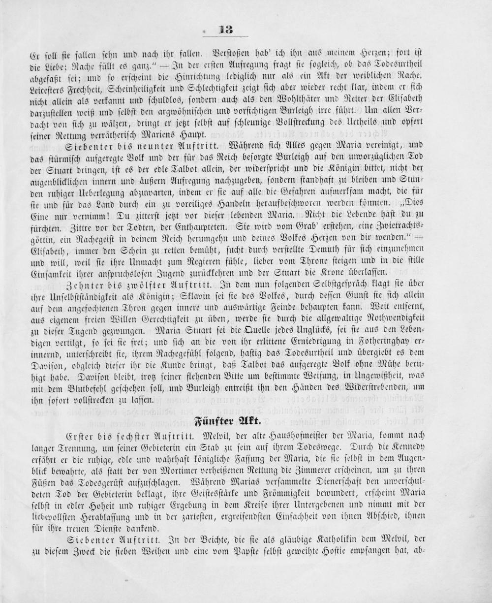 Zehnter bis zwölfter Auftritt. In dem nun folgenden Selbſtgeſpräch klagt ſie über ihre Unſelbſtſtändigkeit als Königin; Sklavin ſei ſie des Volkes, durch deſſen Gunft ſie ſich allein auf dem angefochtenen Thron gegen innere und auswärtige Feinde behaupten kann. Weit entfernt, aus eigenem freien Willen Gerechtigkeit zu üben, werde ſie durch die allgewaltige Nothwendigkeit zu dieſer Tugend gezwungen. Maria Stuart ſei die Quelle jedes Unglücks, ſei ſte aus den Leben⸗ digen vertilgt, ſo ſei ſie frei; und ſich an die von ihr erlittene Erniedrigung in Fotheringhay er— innernd, unterſchreibt ſie, ihrem Rachegefühl folgend, haſtig das Todesurtheil und übergiebt es dem Daviſon, obgleich dieſer ihr die Kunde bringt, daß Talbot das aufgeregte Volk ohne Mühe beru— higt habe. Daviſon bleibt, trotz ſeiner flehenden Bitte um beſtimmte Weiſung, in Ungewißheit, was mit dem Blutbefehl geſchehen ſoll, und Burleigh entreißt ihn den Händen des Widerſtrebenden, um ihn ſofort vollſtrecken zu laſſen.