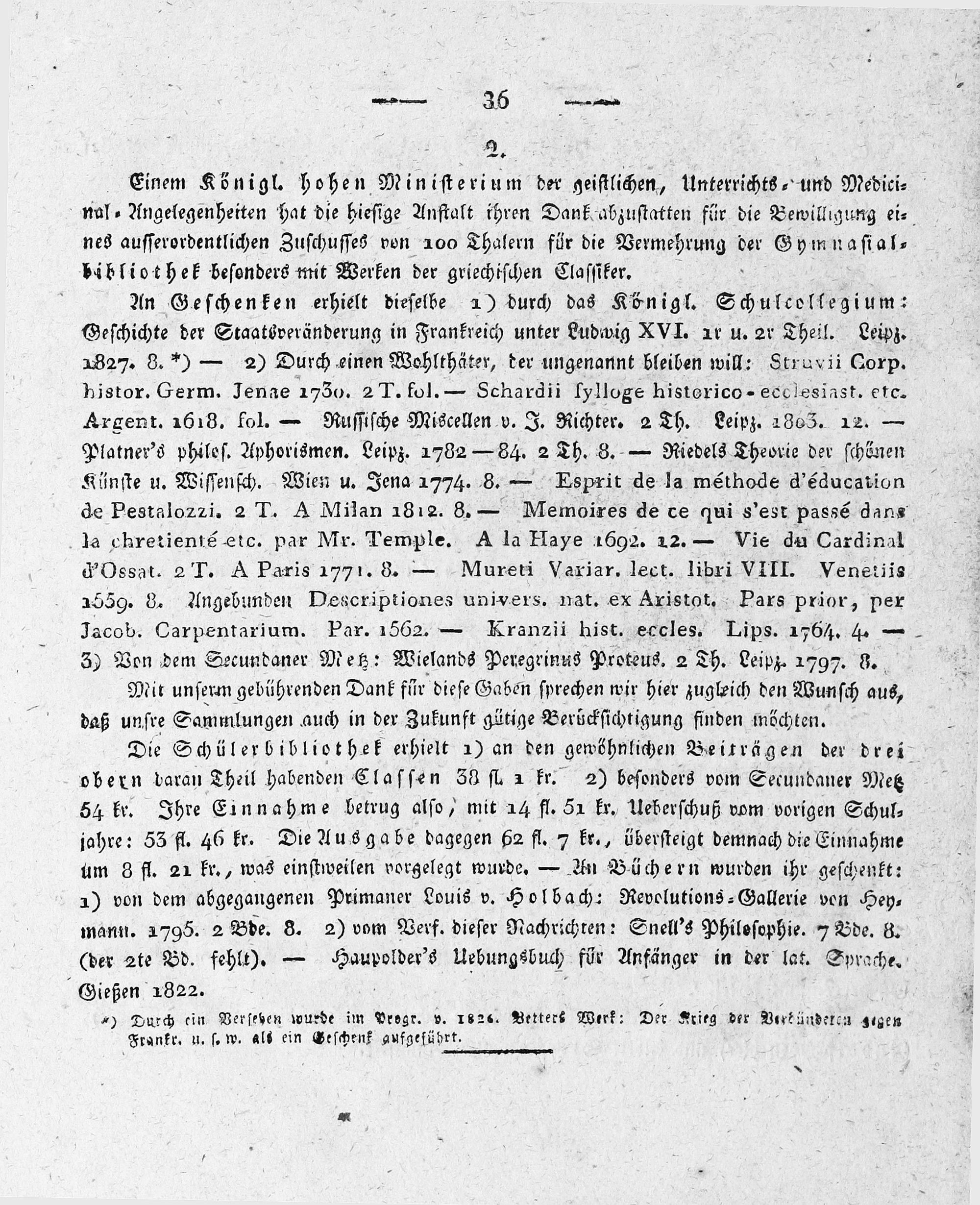 Gießen 1822. *) Durch ein Verſehen wurde im Progr. v. 1826. Betters Werk: Der Krieg der Verkündelen gtgen Frankr. u. ſ. w. als ein Geſchenk aufgeführt.—