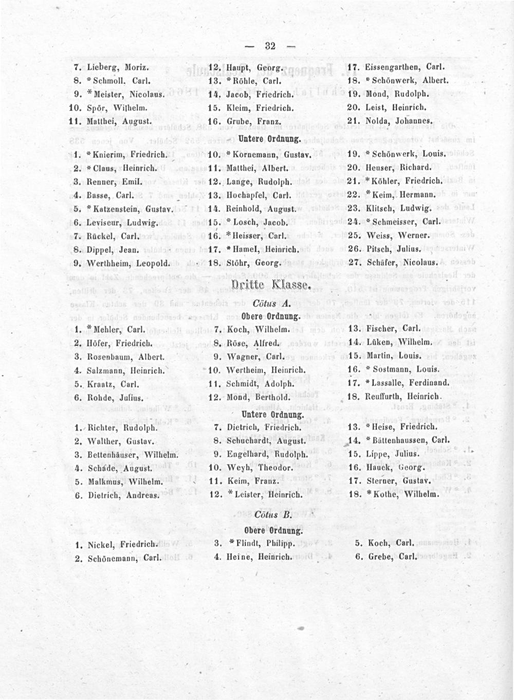Deitte Klasse. Cötus A. Obere Ordnung. Koch, Wilhelm. Röse, Alfred. Wagner, Carl. Wertbeim, Heinrich. Schmidt, Adolph. Mond, Berthold.