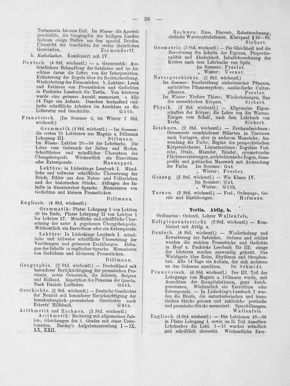 Dillmann. Geographie.(2 Std. wöchentl.)— Deutschland mit besonderer Berücksichtigung der preussischen Pro- vinzen, sowie Osterreich, die Schweiz, Belgien und Holland. Repetition des Pensums der Quarta. Nach Daniels Leitfaden. Güth. Geschichte.(2 Std. wöchentl.)— Deutsche Geschichte der Neuzeit mit besonderer Berücksichtigung der brandenburgisch-preussischen Geschichte nach Eckertz' Hilfsbuch. Güth. Arithmetik und Rechnen.(3 Std. wöchentl.)