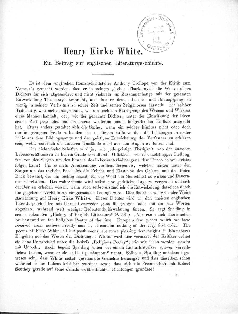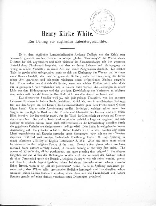 Das dichterische Schaffen wird ja, wie jede geistige Thätigkéit, von den äusseren Lebensverhältnissen in hohem Grade beeinflusst. Glücklich, wer in unabhängiger Stellung, frei von den Sorgen um den Erwerb des Lebensunterhaltes ganz dem Triebe seines Geistes folgen kann! Um so mehr Anerkennung verdient derjenige, welcher mitten unter den Sorgen um das tägliche Brod sich die Frische und Elasticität des Geistes und den freien Blick bewahrt, der ihn tüchtig macht, für das Wohl der Menschheit zu wirken und Dauern- des zu schaffen. Das wahre Genie wird selbst eine gedrückte Lage zu vergessen und sich darüber zu erheben wissen, wenn auch selbstverständlich die Entwickelung desselben durch die gegebenen Verhältnisse einigermassen bedingt wird. Dies findet in weitgehender Weise Anwendung auf Henry Kirke White. Dieser Dichter wird in den meisten englischen Literaturgeschichten mit Unrecht entweder ganz übergangen oder mit ein paar Worten abgethan, wäührend weit weniger Bedeutende Erwähnung finden. So sagt Spalding in seiner bekannten„History of English Litterature“ S. 381:„Nor can much more notice be bestowed on the Religious Poetry of the time. Except a few pieces which we have received from authors already named, it contains nothing of the very first order. The poems of Kirke White, all but posthumous, are more pleasing than original.“ Ein näheres Eingehen auf das Wesen der Dichtungen Whites wird hier vermisst; der Kritiker ordnet sie ohne Unterschied unter die Rubrik„Religious Poetry“; wie wir sehen werden, gewiss mit Unrecht. Auch begeht Spalding einen bei einem Literarhistoriker schwer verzeih- lichen Irrtum, wenn er sie„all but posthumous“ nennt. Sollte es Spalding unbekannt ge- wesen sein, dass White selbst gesammelte Gedichte herausgab und dass dieselben schon während seines Lebens kritisiert wurden; sowie dass sich die Freundschaft mit Robert Southey gerade auf seine damals veröffentlichten Dichtungen gründete!