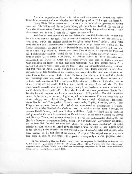 ¹) Eine Abhandlung über den Dichter erschien 1847 im Programm der Realschule zu Barmen, von A. Sommermeyer:„An Essay on the life and writings of Henry Kirke White, in connexion with the con- temporary poets of Great Britain“, sowie 1848 eine zweibändige Biographie von Milnes. Seine Werke sind herausgegeben von R. Southey, zuerst 1807.