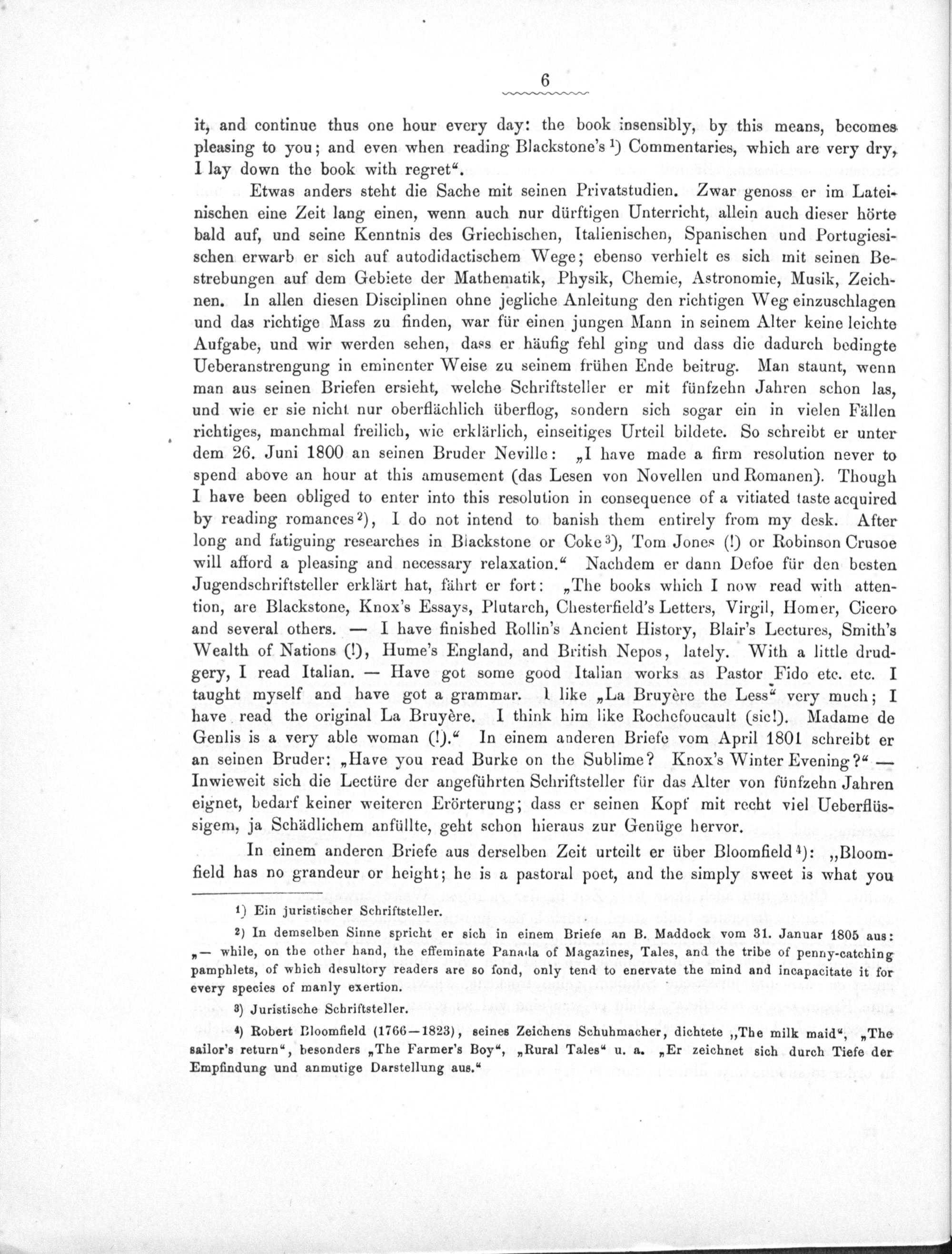 Etwas anders steht die Sache mit seinen Privatstudien. Zwar genoss er im Latei- nischen eine Zeit lang einen, wenn auch nur dürftigen Unterricht, allein auch dieser hörte bald auf, und seine Kenntnis des Griechischen, ltalienischen, Spanischen und Portugiesi- schen erwarb er sich auf autodidactischem Wege; ebenso verhielt es sich mit seinen Be- strebungen auf dem Gebiete der Mathematik, Physik, Chemie, Astronomie, Musik, Zeich- nen. In allen diesen Disciplinen ohne jegliche Anleitung den richtigen Weg einzuschlagen und das richtige Mass zu finden, war für einen jungen Mann in seinem Alter keine leichte Aufgabe, und wir werden sehen, dass er häufig fehl ging und dass die dadurch bedingte Ueberanstrengung in eminenter Weise zu seinem frühen Ende beitrug. Man staunt, wenn man aus seinen Briefen ersieht, welche Schriftsteller er mit fünfzehn Jahren schon las, und wie er sie nicht nur oberflächlich überflog, sondern sich sogar ein in vielen Fällen richtiges, manchmal freilich, wie erklärlich, einseitiges Urteil bildete. So schreibt er unter dem 26. Juni 1800 an seinen Bruder Neville:„I have made a firm resolution never to spend above an hour at this amusement(das Lesen von Novellen und Romanen). Though I have been obliged to enter into this resolution in consequence of a vitiated taste acquired by reading romances²), I do not intend to banish them entirely from my desk. After long and fatiguing researches in Blackstone or Coke ³), Tom Jones(1) or Robinson Crusoe will afford a pleasing and necessary relaxation.“ Nachdem er dann Defoe für den besten Jugendschriftsteller erklärt hat, fährt er fort:„The books which I now read with atten- tion, are Blackstone, Knox's Essays, Plutarch, Chesterfield's Letters, Virgil, Homer, Cicero