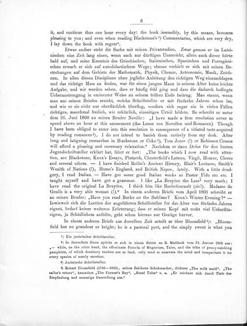 taught myself and have got a grammar. I like„La Bruydère the Less- very much; I have read the original La Bruyère. I think him like Rochefoucault(siel!). Madame de Genlis is a very able woman(1).“ In einem anderen Briefe vom April 1801 schreibt er an seinen Bruder:„Have you read Burke on the Sublime? Knox'’s Winter Evening?“— Inwieweit sich die Lectüre der angeführten Schriftsteller für das Alter von fünfzehn Jahren eignet, bedarf keiner weiteren Erörterung; dass er seinen Kopf mit recht viel Ueberflüs- sigem, ja Schädlichem anfüllte, geht schon hieraus zur Genüge hervor.