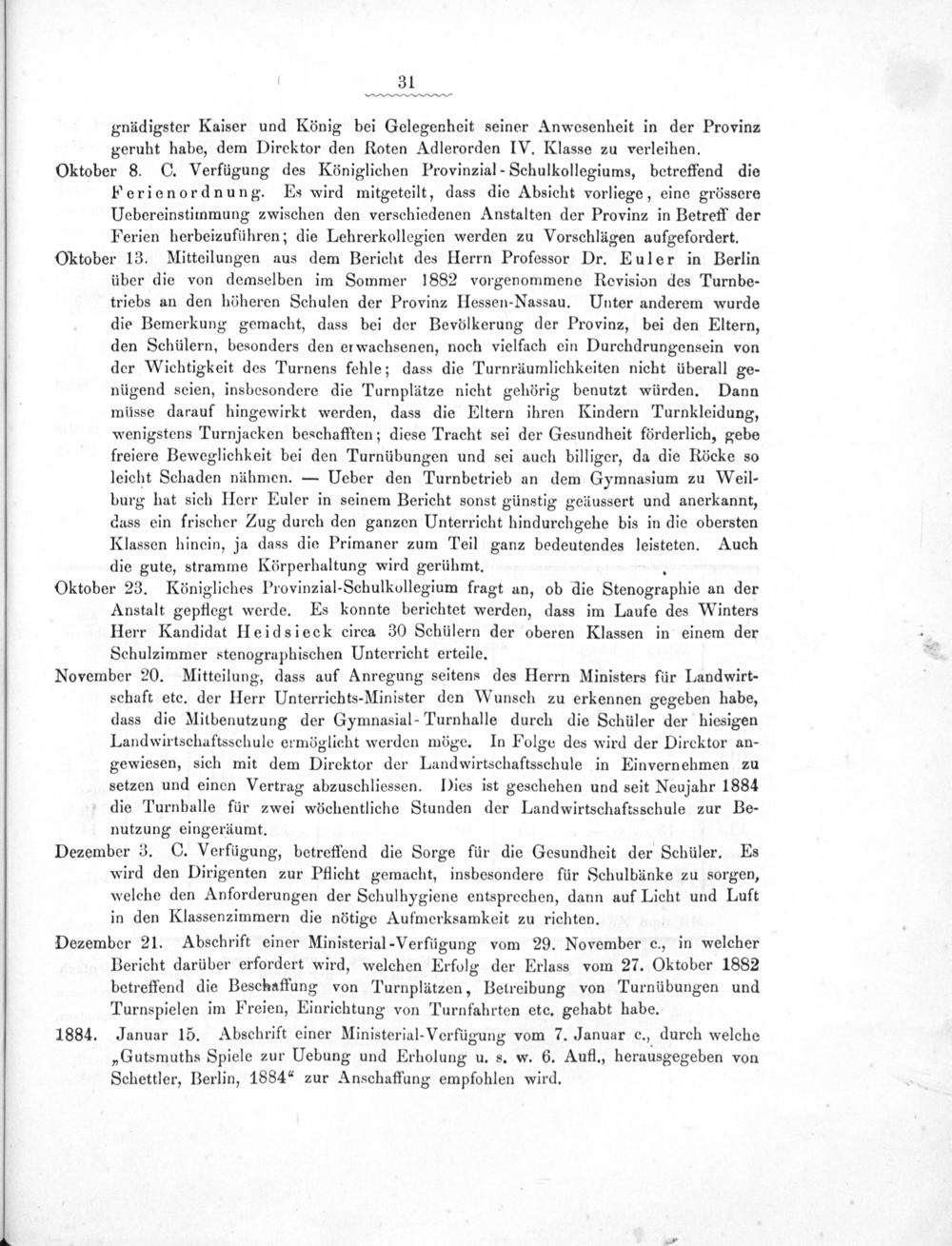 Oktober 13. Mitteilungen aus dem Bericht des Herrn Professor Dr. Euler in Berlin über die von demselben im Sommer 1882 vorgenommene Revision des Turnbe- triebs an den höheren Schulen der Provinz Hessen-Nassau. Unter anderem wurde die Bemerkung gemacht, dass bei der Bevölkerung der Provinz, bei den Eltern, den Schülern, besonders den erwachsenen, noch vielfach ein Durchdrungensein von der Wichtigkeit des Turnens fehle; dass die Turnräumlichkeiten nicht überall ge- nügend scien, insbesondere die Turnplätze nicht gehörig benutzt würden. Dann müsse darauf hingewirkt werden, dass die Eltern ihren Kindern Turnkleidung, wenigstens Turnjacken beschafften; diese Tracht sei der Gesundheit förderlich, gebe freiere Beweglichkeit bei den Turnübungen und sei auch billiger, da die Röcke so leicht Schaden nähmen.— Ueber den Turnbetrieb an dem Gymnasium zu Weil- burg hat sich Herr Euler in seinem Bericht sonst günstig geäussert und anerkannt, dass ein frischer Zug durch den ganzen Unterricht hindurchgehe bis in die obersten Klassen hinein, ja dass die Primaner zum Teil ganz bedeutendes leisteten. Auch die gute, stramme Körperhaltung wird gerühmt.