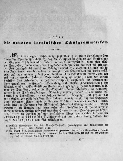 „Es iſt eine eigene Erſcheinung, ſagt Reiſig in ſeinen Vorleſungen uͤber lateiniſche Sprachwiſſenſchaft 1), daß die Deutſchen in Hinſicht auf Bearbeitung der Grammatik ſich von allen andern Nationen unterſcheiden; denn nicht allein die Franzoſen, ſondern auch die Englaͤnder und Italiener bedienen ſich ſeit lan⸗ ger Zeit durchgehends nur Einer Schulgrammatik ²), während bei uns mit je⸗ dem Jahr immer eine die andere verdraͤngt. Nur dadurch laͤßt ſich dieſes erklaͤ⸗ ren, daß man annimmt, daß jene laͤngſt auf dem Standpunkt waren, den wir erſt jetzt zu erreichen ſuchen.« Dieſe Erſcheinung iſt richtig; allein der Grund derſelben liegt vielmehr darin, daß die Franzoſen, Englaͤnder und Italiener mit ihrer gewaltigen, maſſenhaften Sammlung und bloßen Zuſammenſtellung des Materials allen wiſſenſchaftlichen Forderungen genuͤgt zu haben waͤhnten, waͤh⸗ rend die Deutſchen, welche die Unzulaͤnglichkeit davon erkannten, ſich beſtrebten, weiter in die Tiefe einzudringen. Natuͤrlich mußten, ſobald ſie von jenem fru⸗ heren, blos aͤußerlichen, rein empiriſchen Verfahren abgegangen und ſich auf das freie Gebiet der philoſophiſchen Unterſuchung hinausgewagt, auf den verſchieden eingeſchlagenen Wegen auch verſchiedene Reſultate gewonnen werden, welche dann Alle zur Foͤrderung der Wiſſenſchaft Jeder das Seinige mittheilte. Dieſes Beſtreben, die Sprache nach ihren weſentlichen Verhaͤltniſſen uͤberhaupt mehr in ihren innerſten, tiefſten und verborgenſten Elementen und Grundfugen zu begrei⸗ fen, leiteten die Forſcher auf zwei verſchiedene Wege, von welchen der eine der etymologiſch⸗hiſtoriſche iſt, waͤhrend auf dem andern das gruͤndliche Er⸗ faſſen des Satzbaus zum Ziel geſteckt war.