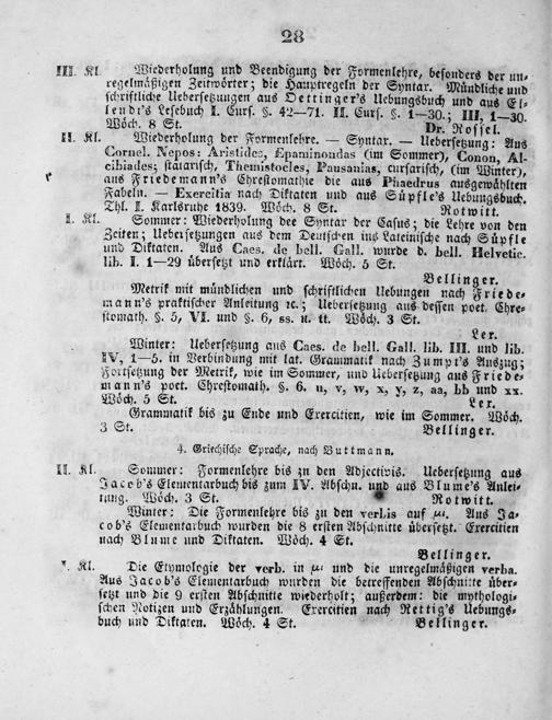 Sommer: Wiederholung dee Soyntax der Caſus; die Lehre von den Zeiten; Ueberſetzungen aus dem Deutſchen ing Lateiniſche nach Suͤpfle und Diktaten. Aus Caes. de bell. Gall. wurde d. bell. Helvetic. lib. I. 1—29 uͤberſetzt und erklaͤrt. Woͤch. 5 St.