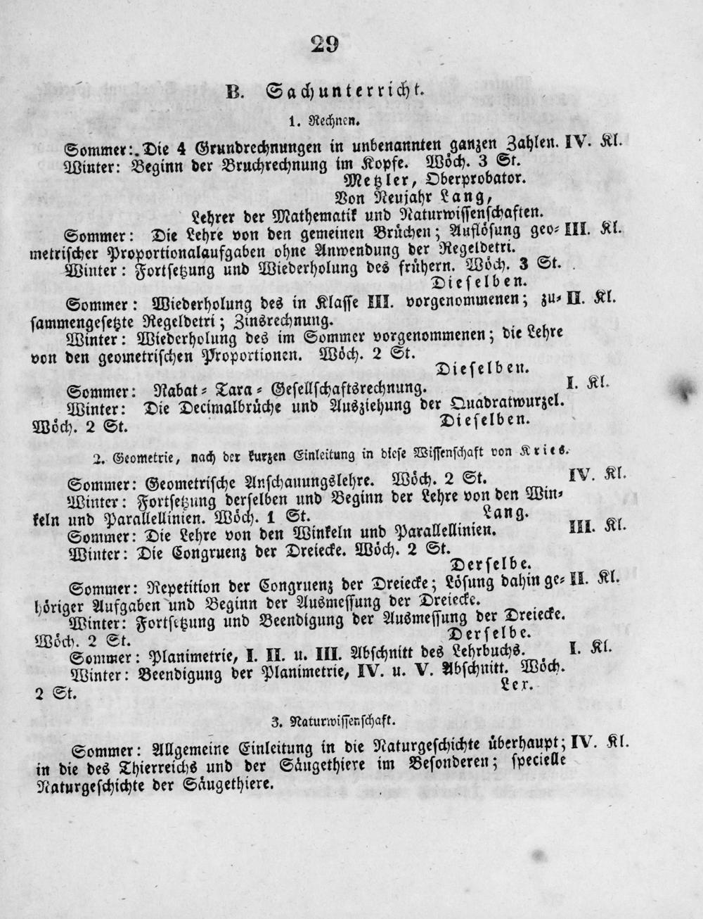 Sommer:. Die 4 Grundrechnungen in unbenannten ganzen Zahlen. IV. Kl. Winter: Beginn der Bruchrechnung im Kopfe. Woͤch. 3 St. Metzler, Oberprobator. Von Neujahr Lang, Lehrer der Mathematik und Naturwiſſenſchaften. Sommer: Die Lehre von den gemeinen Bruͤchen; Aufloͤſung geo⸗III. Kl. metriſcher Proportionalaufgaben ohne Anwendung der Regeldetri. Winter: Fortſetzung und Wiederholung des fruͤhern. Woh 3 St. Dieſelben. Sommer: Wiederholung des in Klaſſe III. vorgenommenen; zu⸗II. Kl. ſammengeſetzte Regeldetri; Zinsrechnung. Winter: Wiederholung des im Sommer vorgenommenen; die Lehre von den geometriſchen Proportionen. Woͤch. 2 St. Dieſelben.