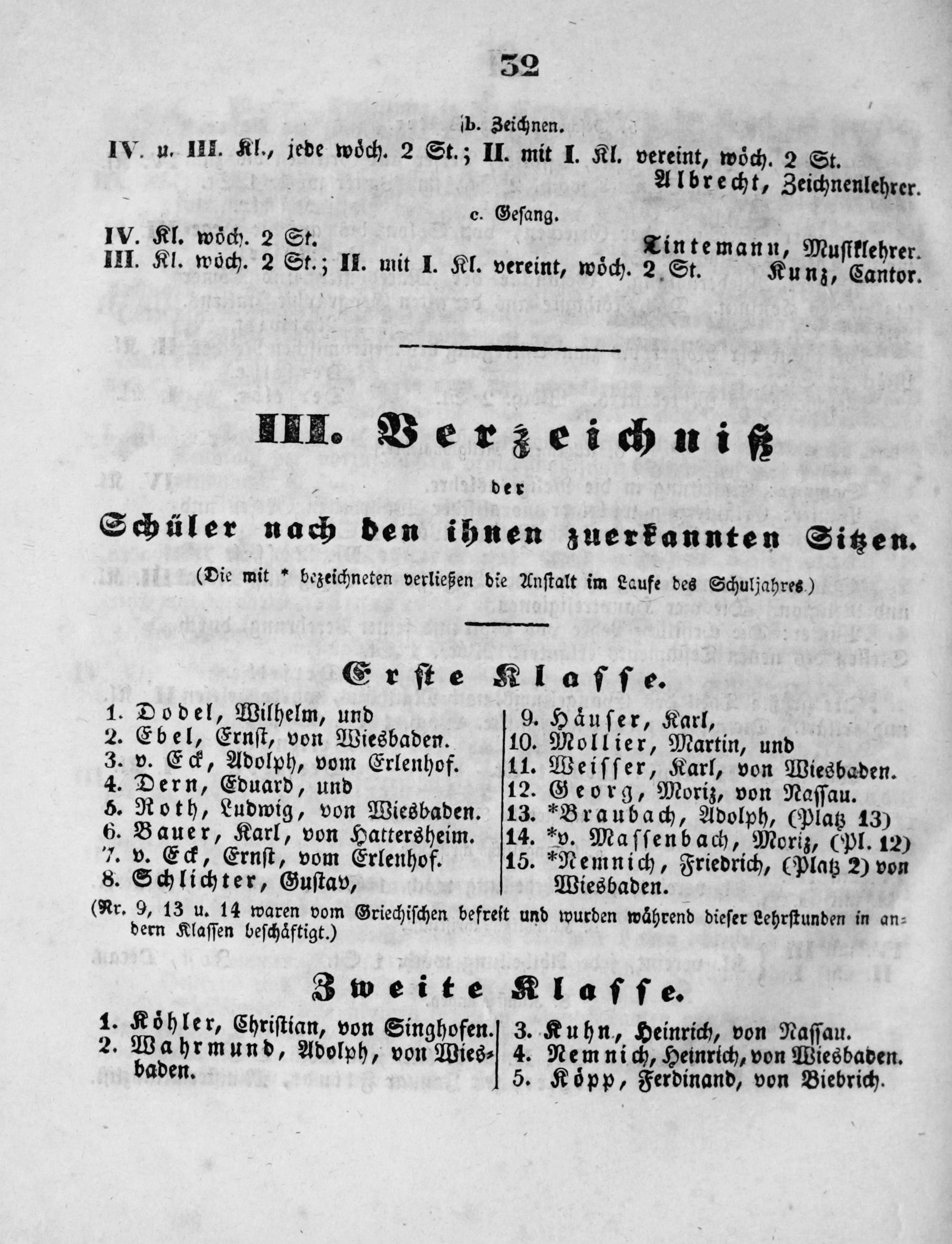 ib. Zeichnen. IV. u. III. Kl., jede woͤch. 2 St.; II. mit I. Kl. vereint, woöch. 2 St. Albrecht, Zeichnenlehrer. c. Geſang.