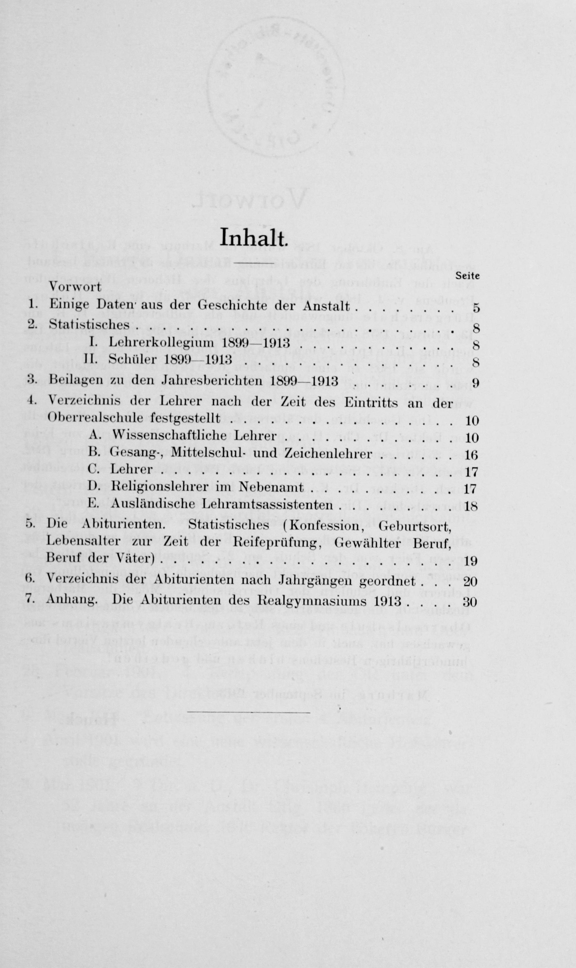 Vorwort Einige Daten aus der Geschichte der Anstalt...... Statistisches........................ I. Lehrerkollegium 1899 1913............ II. Schüler 1899— 1913.... Beilagen zu den Jahresberichten 1899— 1913.... Verzeichnis der Lehrer nach der Zeit des Eintritts an der Oberrealschule festgestellt........... A. Wissenschaftliche Lehrer............. B. Gesang-, Mittelschul- und Zeichenlehrer...... C. Lehrer.................... D. Religionslehrer im Nebenamt......... E. Ausländische Lehramtsassistenten.... Die Abiturienten. Statistisches(Konfession, Geburtsort, Lebensalter zur Zeit der Reifeprüfung, Gewählter Beruf, Beruf der Väter)............. Verzeichnis der Abiturienten nach Jahrgängen geordnet.. Anhang. Die Abiturienten des Realgymnasiums 1913.