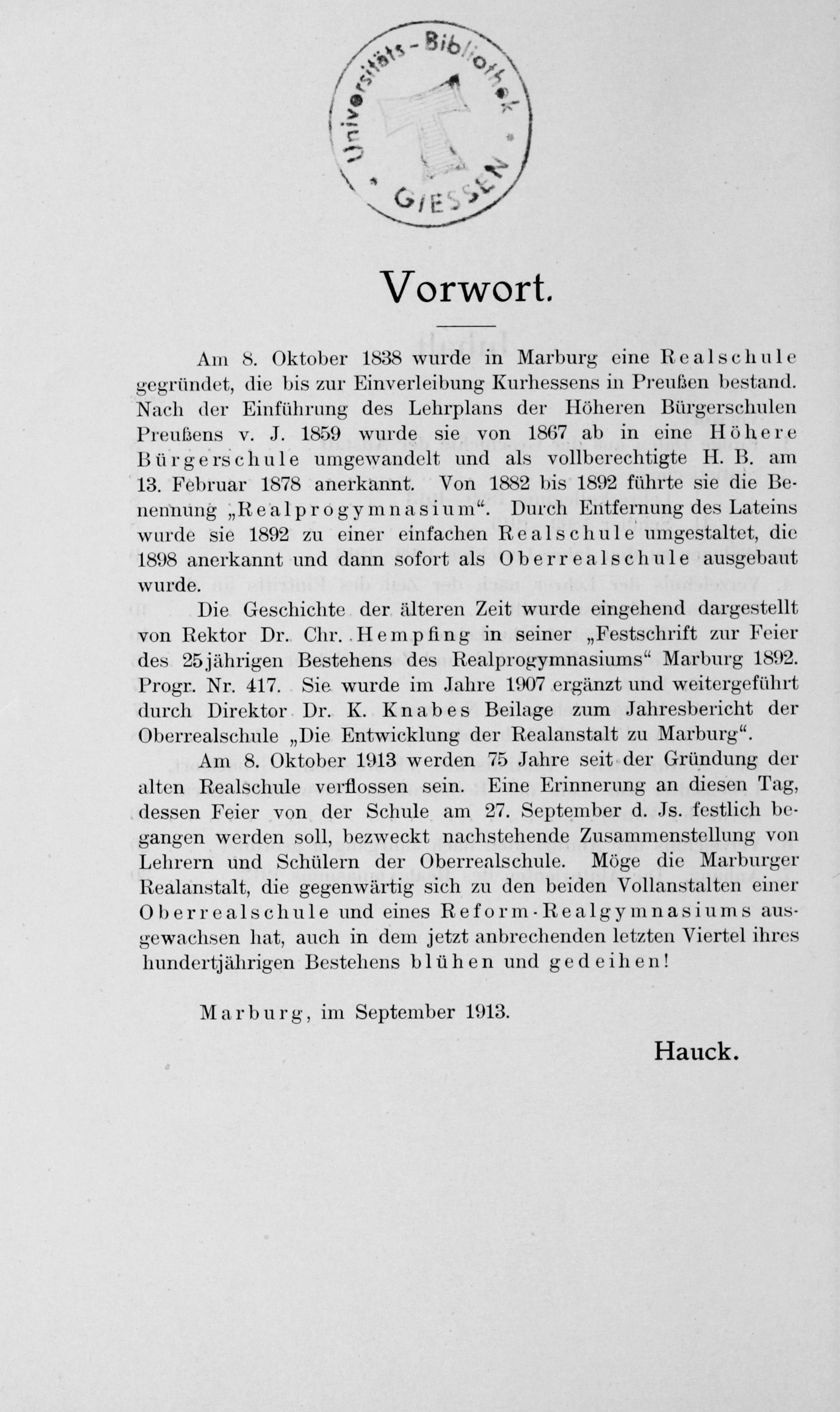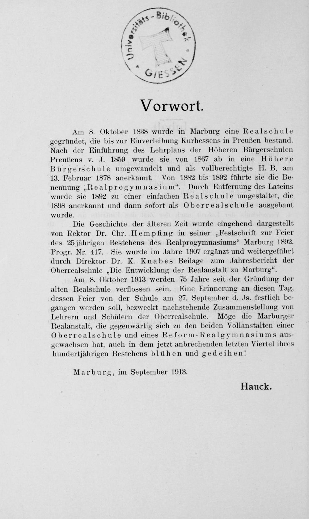 Am 8. Oktober 1913 werden 75 Jahre seit der Gründung der alten Realschule verflossen sein. Eine Erinnerung an diesen Tag, dessen Feier von der Schule am 27. September d. Js. festlich be- gangen werden soll, bezweckt nachstehende Zusammenstellung von Lehrern und Schülern der Oberrealschule. Möge die Marburger Realanstalt, die gegenwärtig sich zu den beiden Vollanstalten einer Oberrealschule und eines Reform-Realgymnasiums aus- gewachsen hat, auch in dem jetzt anbrechenden letzten Viertel ihres hundertjährigen Bestehens blühen und gedeihen!