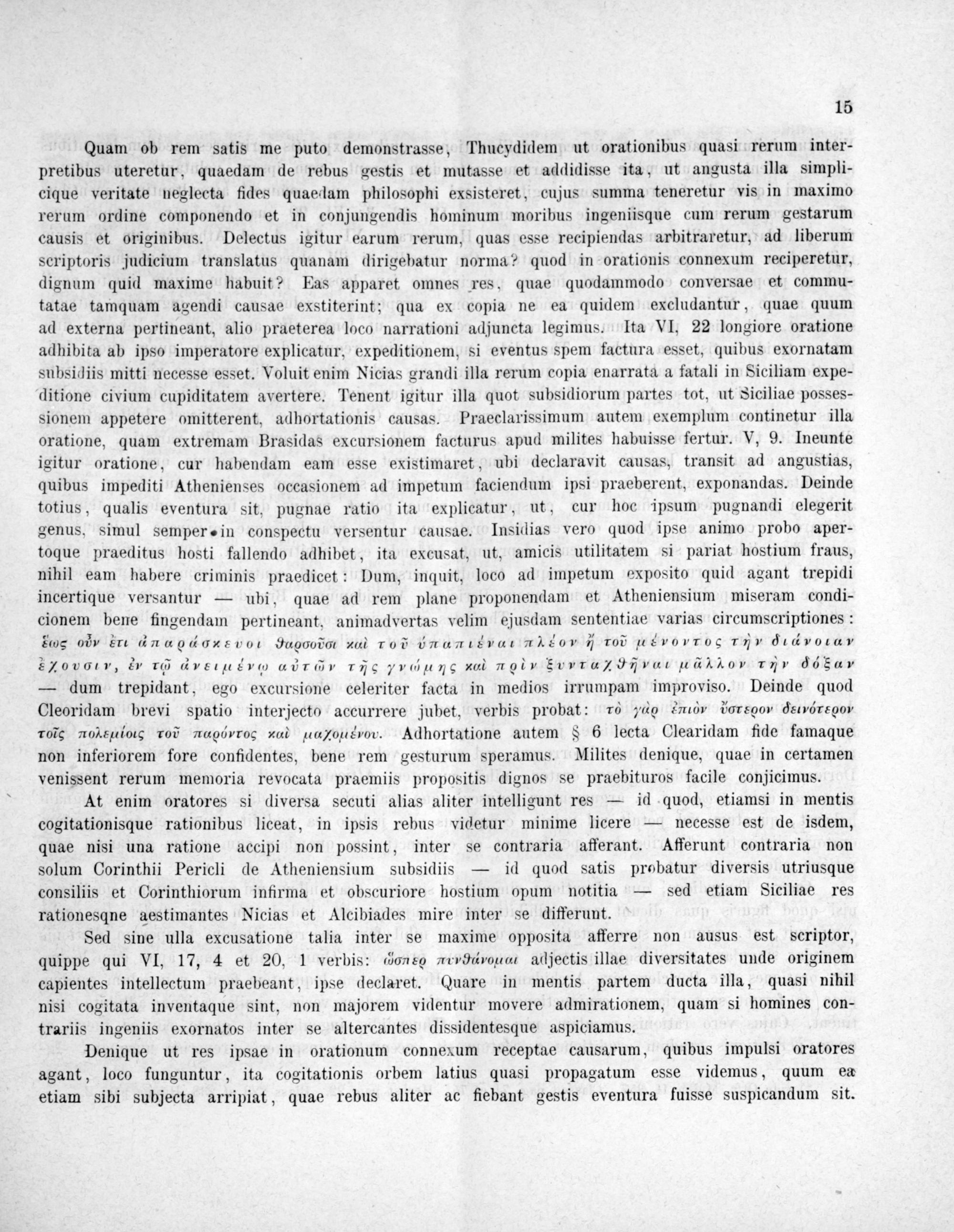 Quam ob rem satis me puto demonstrasse, Thucydidem ut orationibus quasi rerum inter- pretibus uteretur, quaedam de rebus gestis et mutasse et addidisse ita, ut angusta illa simpli- cique veritate neglecta fides quaedam philosophi exsisteret, cujus summa teneretur vis in maximo rerum ordine componendo et in conjungendis hominum moribus ingeniisque cum rerum gestarum causis et originibus. Delectus igitur earum rerum, quas esse recipiendas arbitraretur, ad liberum scriptoris judicium translatus quanam dirigebatur norma? quod in orationis connexum reciperetur, dignum quid maxime habuit? Eas apparet omnes res, quae quodammodo conversae et commu- tatae tamquam agendi causae exstiterint; qua ex copia ne ea quidem excludantur, quae quum ad externa pertineant, alio praeterea loco narrationi adjuncta legimus. Ita VI, 22 longiore oratione adhibita ab ipso imperatore explicatur, expeditionem, si eventus spem factura esset, quibus exornatam subsidiis mitti necesse esset. Voluit enim Nicias grandi illa rerum copia enarrata a fatali in Siciliam expe- ditione civium cupiditatem avertere. Tenent igitur illa quot subsidiorum partes tot, ut Siciliae posses- sionem appetere omitterent, adhortationis causas. Praeclarissimum autem exemplum continetur illa oratione, quam extremam Brasidas excursionem facturus apud milites habuisse fertur. V, 9. Ineunte igitur oratione, cur habendam eam esse existimaret, ubi declaravit causas, transit ad angustias, quibus impediti Athenienses occasionem ad impetum faciendum ipsi praeberent, exponandas. Deinde totius, qualis eventura sit, pugnae ratio ita explicatur, ut, cur hoc ipsum pugnandi elegerit genus, simul semper-in conspectu versentur causae. Insidias vero quod ipse animo probo aper- toque praeditus hosti fallendo adhibet, ita excusat, ut, amicis utilitatem si pariat hostium fraus, nihil eam habere criminis praedicet: Dum, inquit, loco ad impetum exposito quid agant trepidi incertique versantur— ubi, quae ad rem plane proponendam et Atheniensium miseram condi- cionem bene fingendam pertineant, animadvertas velim ejusdam sententiae varias circumscriptiones: 1 Ody Ere dnaodoε νοι dHp'dοdνot zal rod unanrtlsrar ror rod Hν0 r ddrαν ovotεν, 2r 1 Aειάϊτι αιν rνόνς νàα mπ⁶εννᷣννια m,ά¹α, ειον τννν ϑέƷαν — dum trepidant, ego excursione celeriter facta in medios irrumpam improviso. Deinde quod Cleoridam brevi spatio interjecto accurrere jubet, verbis probat: r„αάο εειιν νυσατειο õ§⁴st τεμεοονσ roc roxεεας o? aαoνoc zad ανοονοω. Adhortatione autem§ 6 lecta Clearidam fide famaque non inferiorem fore confidentes, bene rem gesturum speramus. Milites denique, quae in certamen venissent rerum memoria revocata praemiis propositis dignos se praebituros facile conjicimus.