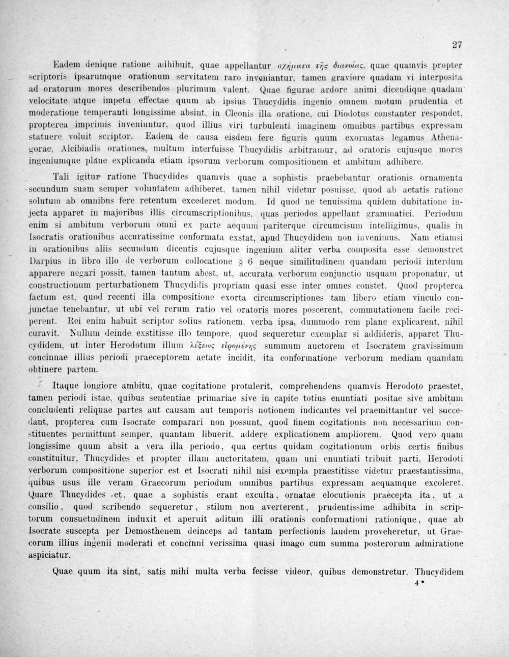 Itaque longiore ambitu, quae cogitatione protulerit, comprehendens quamvis Herodoto praestet, tamen periodi istae, quibus sententiae primariae sive in capite totius enuntiati positae sive ambitum concludenti reliquae partes aut causam aut temporis notionem indicantes vel praemittantur vel succe- dant, propterea cum Isocrate comparari non possunt, quod finem cogitationis non necessarium con- stituentes permittunt semper, quantam libuerit, addere explicationem ampliorem. Quod vero quam longissime quum absit a vera illa periodo, qua certus quidam cogitationum orbis certis finibus constituitur, Thucydides et propter illam auctoritatem, quam uni enuntiati tribuit parti, Herodoti verborum compositione superior est et Isocrati nihil nisi exempla praestitisse videtur praestantissima, quibus usus ille veram Graecorum periodum omnibus partibus expressam aequamque excoleret. Quare Thucydides et, quae a sophistis erant exculta, ornatae elocutionis praecepta ita, ut a consilio, quod scribendo sequeretur, stilum non averterent, prudentissime adhibita in scrip- torum consuetudinem induxit et aperuit aditum illi orationis conformationi rationique, quae ab Isocrate suscepta per Demosthenem deinceps ad tantam perfectionis laudem proveheretur, ut Grae- corum illius ingenii moderati et concinni verissima quasi imago cum summa posterorum admiratione aspiciatur.
