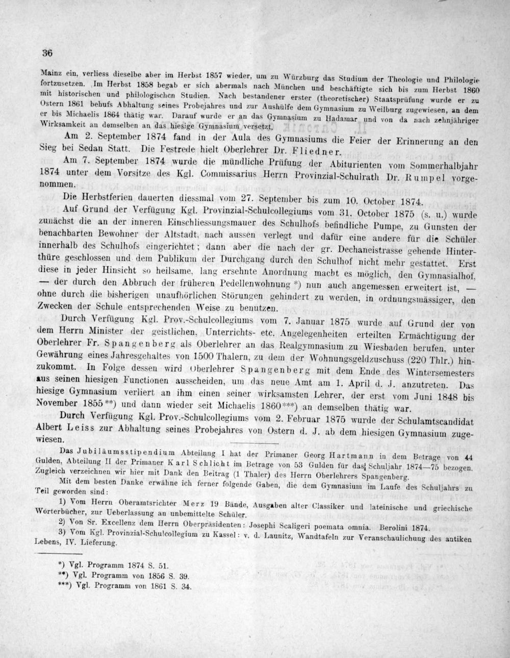 Durch Verfügung Kęl. Prov.-Schulcollegiums vom 7. Januar 1875 wurde auf Grund der von dem Herrn Minister der geistlichen. Unterrichts- etc. Angelegenheiten erteilten Ermächtigung der Oberlehrer Fr. Spangenberg als Oberlehrer an das Realgymnasium zu Wiesbaden berufen, unter Gewährung eines Jahresgehaltes von 1500 Thalern, zu dem der Wohnungsgeldzuschuss(220 Thlr.) hin- zukommt. In Folge dessen wird Oberlehrer Spangenberg mit dem Ende des Wintersemesters aus seinen hiesigen Functionen ausscheiden, um das neue Amt am 1. April d. J. anzutreten. Das hiesige Gymnasium verliert an ihm einen seiner wirksamsten Lehrer, der erst vom Juni 1848 bis November 1855**) und dann wieder seit Michaelis 1860*9) an demselben thätig war.