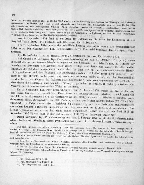 Mainz ein, verliess dieselbe aber im Herbst 1857 wieder, um zu Würzburg das Studium der Theologie und Philologie fortzusetzen. Im Herbst 1858 begab er sich abermals nach München und beschäftigte sich bis zum Herbst 1860 mit historischen und philologischen Studien. Nach bestandener erster(theoretischer) Staatsprüfung wurde er zu Ostern 1861 behufs Abhaltung seines Probejahres und zur Aushülfe dem Gymnasium zu Weilburg zugewiesen, an dem er bis Michaelis 1864 thäatig war. Darauf wurde er an das Gymnasium zu Hadamar und von da nach zehnjähriger Wirksamkeit an demselben an das hiesige Gymnasium versetzt.