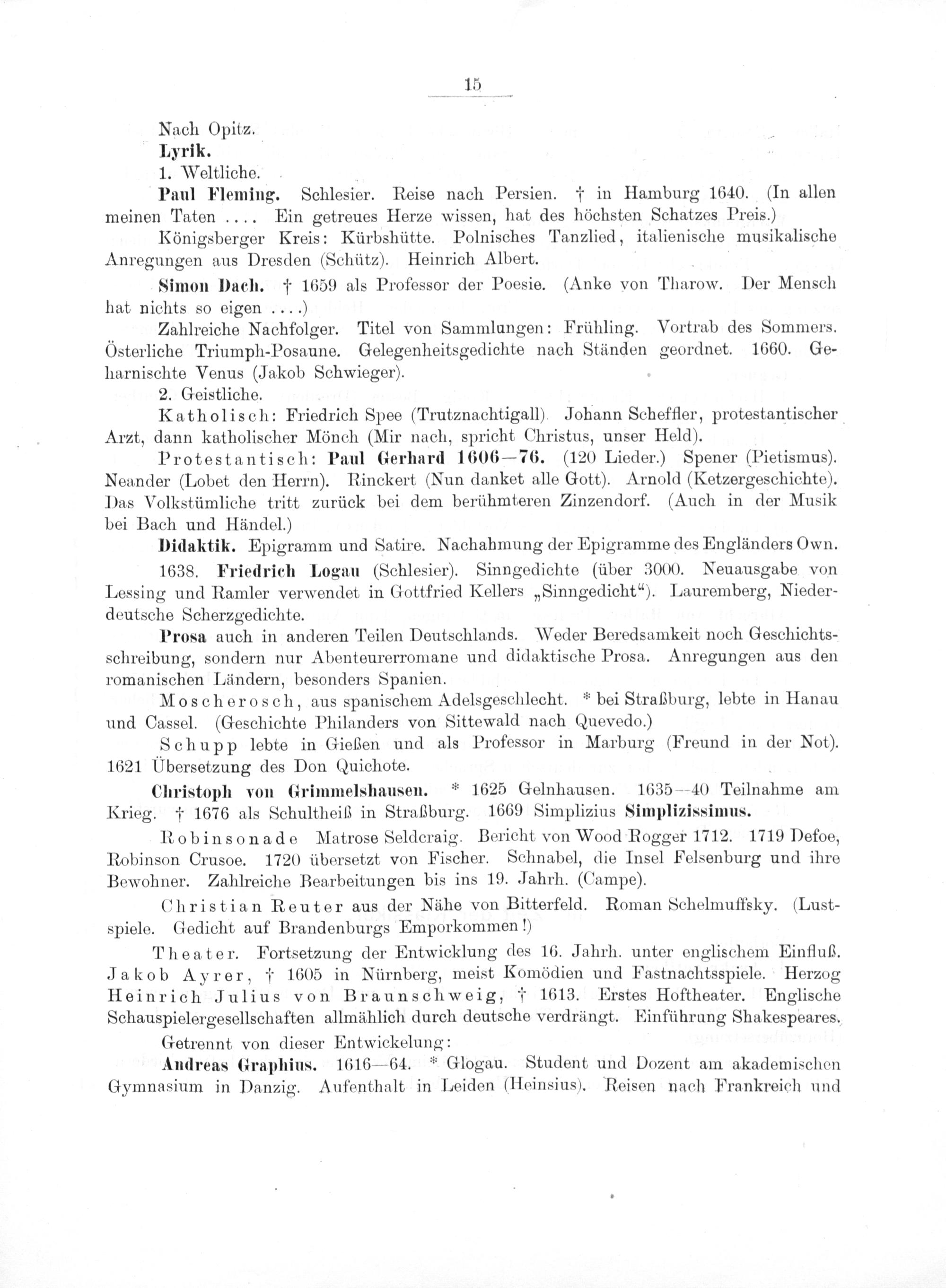 Schauspielergesellschaften allmählich durch deutsche verdrängt. Einführung Shakespeares. Getrennt von dieser Entwickelung: Andreas Graphius. 1616— 64.* Glogau. Student und Dozent am akademischen Gymnasium in Danzig. Aufenthalt in Leiden(Heinsius). Reisen nach Frankreich und