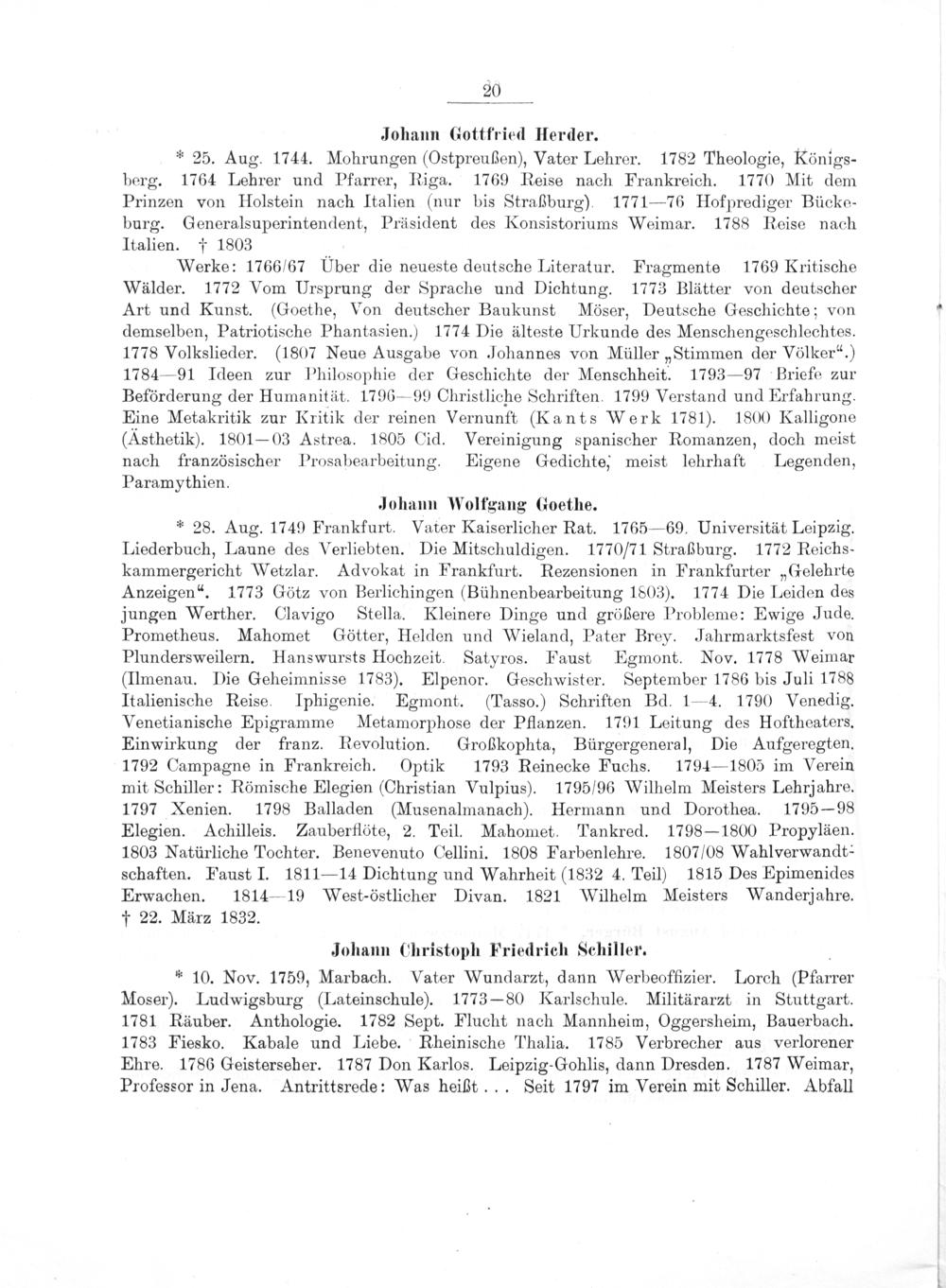 * 28. Aug. 1749 Frankfurt. Vater Kaiserlicher Rat. 1765—69. Universität Leipzig. Liederbuch, Laune des Verliebten. Die Mitschuldigen. 1770/71 Straßburg. 1772 Reichs- kammergericht Wetzlar. Advokat in Frankfurt. Rezensionen in Frankfurter„Gelehrte Anzeigen“. 1773 Götz von Berlichingen(Bühnenbearbeitung 1803). 1774 Die Leiden des jungen Werther. Clavigo Stella. Kleinere Dinge und größere Probleme: Ewige Jude. Prometheus. Mahomet Götter, Helden und Wieland, Pater Brey. Jahrmarktsfest von Plundersweilern. Hanswursts Hochzeit. Satyros. Faust Egmont. Nov. 1778 Weimar (Ilmenau. Die Geheimnisse 1783). Elpenor. Geschwister. September 1786 bis Juli 1788 Italienische Reise. Iphigenie. Egmont.(Tasso.) Schriften Bd. 1—4. 1790 Venedig. Venetianische Epigramme Metamorphose der Pflanzen. 1791 Leitung des Hoftheaters. Einwirkung der franz. Revolution. Großkophta, Bürgergeneral, Die Aufgeregten. 1792 Campagne in Frankreich. Optik 1793 Reinecke Fuchs. 1794— 1805 im Verein mit Schiller: Römische Elegien(Christian Vulpius). 1795/96 Wilhelm Meisters Lehrjahre. 1797 Xenien. 1798 Balladen(Musenalmanach). Hermann und Dorothea. 1795—- 98 Elegien. Achilleis. Zauberflöte, 2. Teil. Mahomet. Tankred. 1798— 1800 Propyläen. 1803 Natürliche Tochter. Benevenuto Cellini. 1808 Farbenlehre. 1807/08 Wahlverwandt- schaften. Faust I. 1811—14 Dichtung und Wahrheit(1832 4. Teil) 1815 Des Epimenides Erwachen. 1814—19 West-östlicher Divan. 1821 Wilhelm Meisters Wanderjahre. † 22. März 1832.