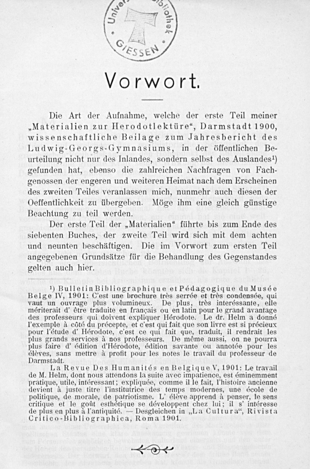 Die Art der Aufnahme, welche der erste Teil meiner „Materialien zur Herodotlektüre“, Darmstadt 1900, wissenschaftliche Beilage zum Jahresbericht des Ludwig-Georgs-Gymnasiums, in der öffentlichen Be- urteilung nicht nur des Inlandes, sondern selbst des Auslandes) gefunden hat, ebenso die zahlreichen Nachfragen von Fach- genossen der engeren und weiteren Heimat nach dem Erscheinen des zweiten Peiles veranlassen mich, nunmehr auch diesen der Oeffentlichkeit zu übergeben. Möge ihm eine gleich günstige Beachtung zu teil werden.