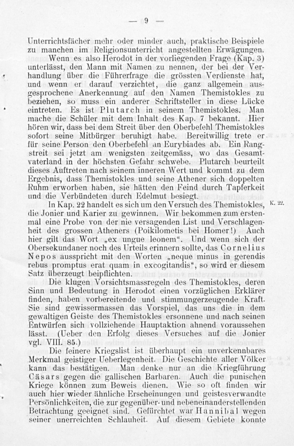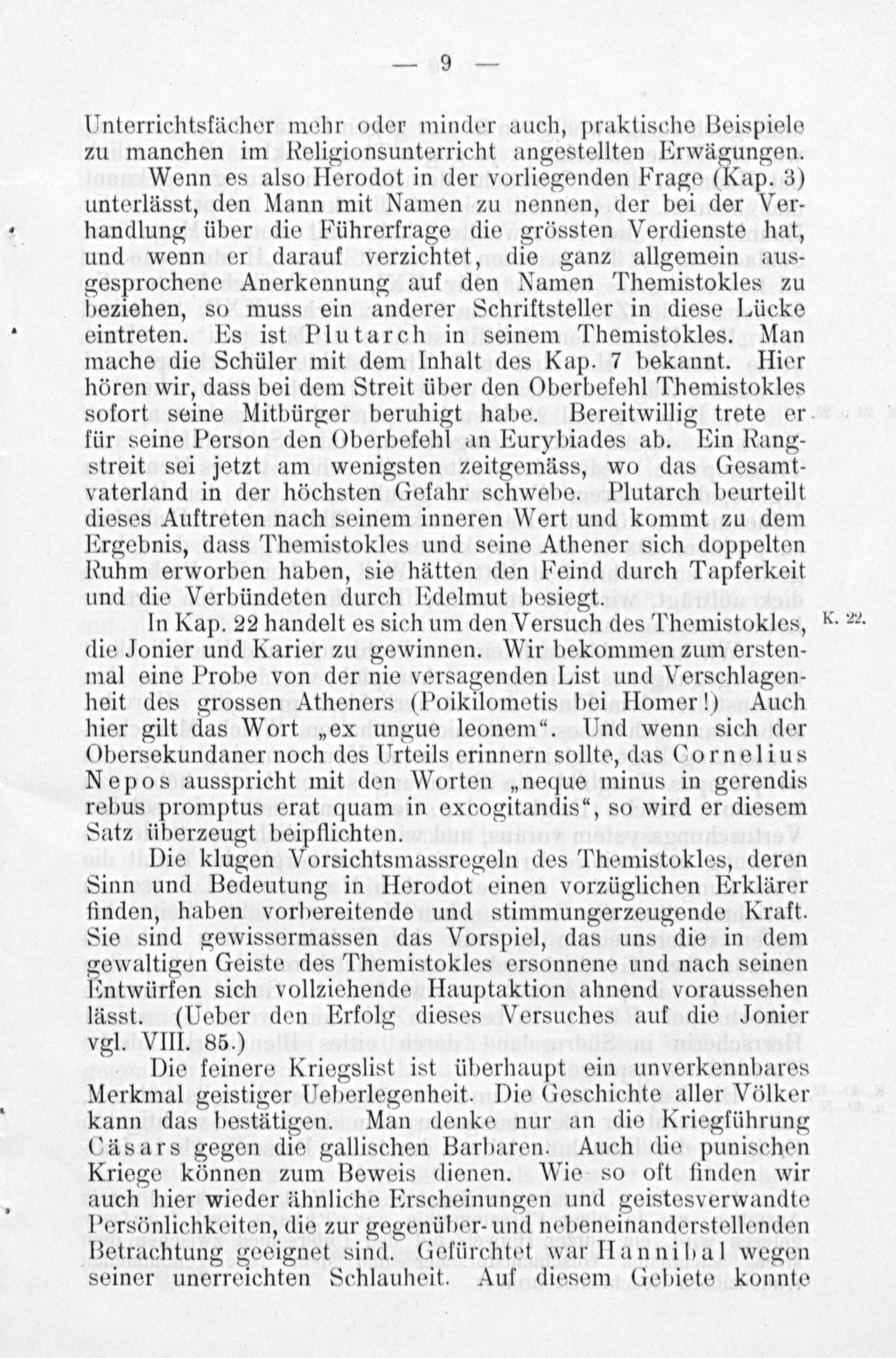 In Kap. 22 handelt es sich um den Versuch des Themistokles, die Jonier und Karier zu gewinnen. Wir bekommen zum ersten- mal eine Probe von der nie versagenden List und Verschlagen- heit des grossen Atheners(Poikilometis bei Homer!) Auch hier gilt das Wort„ex ungue leonem“. Und wenn sich der Obersekundaner noch des Urteils erinnern sollte, das Cornelius Nepos ausspricht mit den Worten„neque minus in gerendis rebus promptus erat quam in excogitandis“, so wird er diesem Satz überzeugt beipflichten.