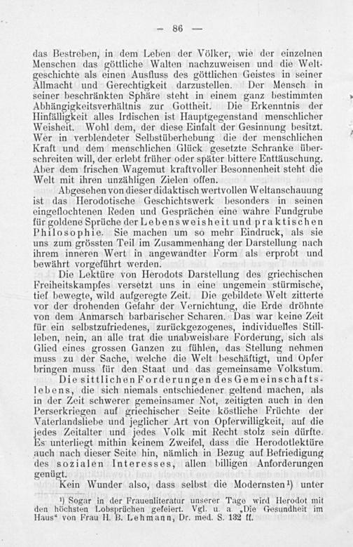 Diesittlichen Forderungen des Gemeinschafts- lebens, die sich niemals entschiedener geltend machen, als in der Zeit schwerer gemeinsamer Not, zeitigten auch in den Perserkriegen auf griechischer Seite köstliche Früchte der Vaterlandsliebe und jeglicher Art von Opferwilligkeit, auf die jedes Zeitalter und jedes Volk mit Recht stolz sein dürfte. Es unterliegt mithin keinem Zweifel, dass die Herodotlektüre auch nach dieser Seite hin, nämlich in Bezug auf Befriedigung des sozialen Interesses, allen billigen Anforderungen genügt.