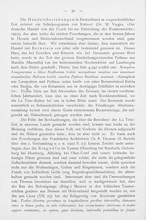 Die Handelsbeziehungen in Deutschland in vorgeschichtlicher Zeit erörtert ein Schulprogramm von Ruhrort(Dr. W. Varges,»Der deutsche Handel von der Urzeit bis zur Entstehung des Frankenreichs-, 1903), das aber leider die reichen Forschungen, die in den letzten Jahren in Hessen und Südwestdeutschland vorgenommen worden sind, ganz ausser betracht lässt. Wir entnehmen aber daraus, dass namentlich der Handel mit Bernstein von jeher sehr bedeutend gewesen ist. Dieses Harz, das bei Griechen und Römern wie bei Germanen grossen Wert hatte, wurde in der Zeit des grossen Entdeckungsreisenden Pytheas aus Massilia(Marseille) von der holsteinischen Nordseeküste auf Landwegen nach dem Süden geschafft; Plinius(nat. hist. 4, 94) erzählt uns: Xenophon Lampsacenus a litore Scitharum hidui narigatione insulam esse immeénsae magnitudine Balciam tradit, eundem Poitheas Buasiliam nominat;»Xenophon aus Lampsakus und Pytheas reden beide von einer Bernsteininsel Balcia oder Basilia, die von Britannien aus in dreitägiger Schiffahrt zu erreichen iste, Pyteas lebte zur Zeit Alexanders des Grossen, im vierten vorchrist- lichen Jahrhundert, kam also zu einer Zeit nach Norddeutschland, wo die La Tène-Kultur bei uns in hoher Blüte stand. Der Bernstein wurde namentlich zu Schmuckstücken verarbeitet; die Friedberger Altertums- sammlung besitzt zwei einem Grabe entnommene Bernsteinringe, die auf- gereiht als Halsschmuck getragen worden sind.