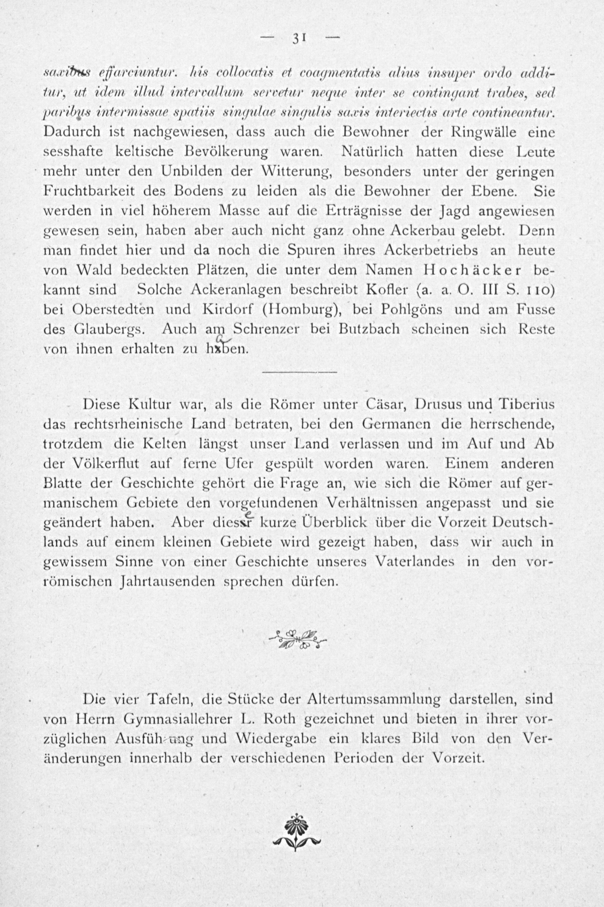 saaibs offareiuntur. his collocatis et coagmentatis alius insuper ordo addi- kur, ut idem illad intoercallum sorvetur neque intor se contingant trabes, sed paribas intoermissue spatiis singulae singulis saxis intoriectis arte contineantun. Dadurch ist nachgewiesen, dass auch die Bewohner der Ringwälle eine sesshafte keltische Bevölkerung waren. Natürlich hatten diese Leute mehr unter den Unbilden der Witterung, besonders unter der geringen Fruchtbarkeit des Bodens zu leiden als die Bewohner der Ebene. Sie werden in viel höherem Masse auf die Erträgnisse der Jagd angewiesen gewesen sein, haben aber auch nicht ganz ohne Ackerbau gelebt. Denn man findet hier und da noch die Spuren ihres Ackerbetriebs an heute von Wald bedeckten Plätzen, die unter dem Namen Hochäcker be- kannt sind Solche Ackeranlagen beschreibt Kofler(a. a. O. III S. 110) bei Oberstedten und Kirdorf(Hlomburg), bei Pohlgöns und am Fusse des Glaubergs. Auch am Schrenzer bei Butzbach scheinen sich Reste von ihnen erhalten zu haben.