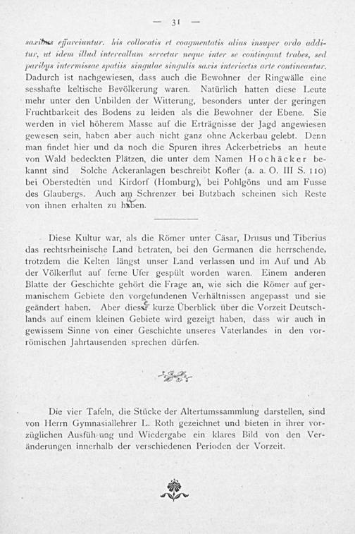 Diese Kultur war, als die Römer unter Cäsar, Drusus und Tiberius das rechtsrheinische Land betraten, bei den Germanen die herrschende, trot⸗dem die Kelten längst unser Land verlassen und im Auf und Ab der Völkerflut auf ferne Ufer gespült worden waren. Einem anderen Blatte der Geschichte gehört die Frage an, wie sich die Römer auf ger- manischem Gebiete den vorgefundenen Verhältnissen angepasst und sie geändert haben. Aber diess kurze Uberblick über die Vorzeit Deutsch- lands auf einem kleinen Gebiete wird gezeigt haben, dass wir auch in gewissem Sinne von einer Geschichte unseres Vaterlandes in den vor- römischen Jahrtausenden sprechen dürfen.