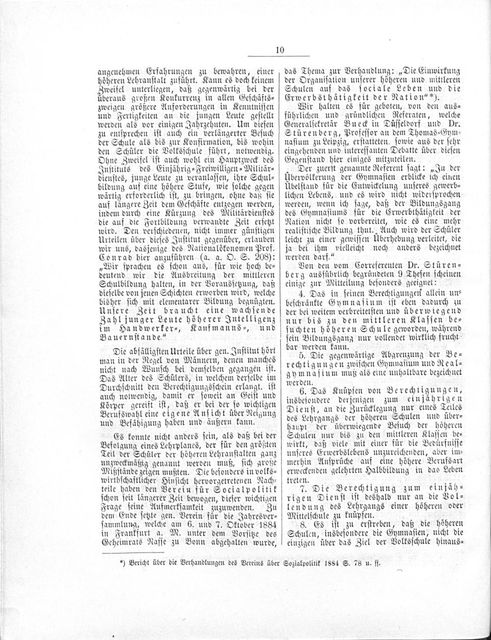 Es konnte nicht anders ſein, als daß bei der Befolgung eines Lehrplanes, der für den größten Teil der Schüler der höheren Lehranſtalten ganz unzweckmäßig genannt werden muß, ſich große Mißſtände zeigen mußten. Die beſonders in volks⸗ wirthſchaftlicher Hinſicht hervorgetretenen Nach⸗ teile haben den Verein für Socialpolitik ſchon ſeit längerer Zeit bewogen, dieſer wichtigen Frage ſeine Aufmerkſamkeit zuzuwenden. Zu dem Ende ſetzte gen. Verein für die Jahresver⸗ ſammlung, welche am 6. und 7. Oktober 1884 in Frankfurt a. M. unter dem Vorſitze des Geheimrats Naſſe zu Bonn abgehalten wurde,