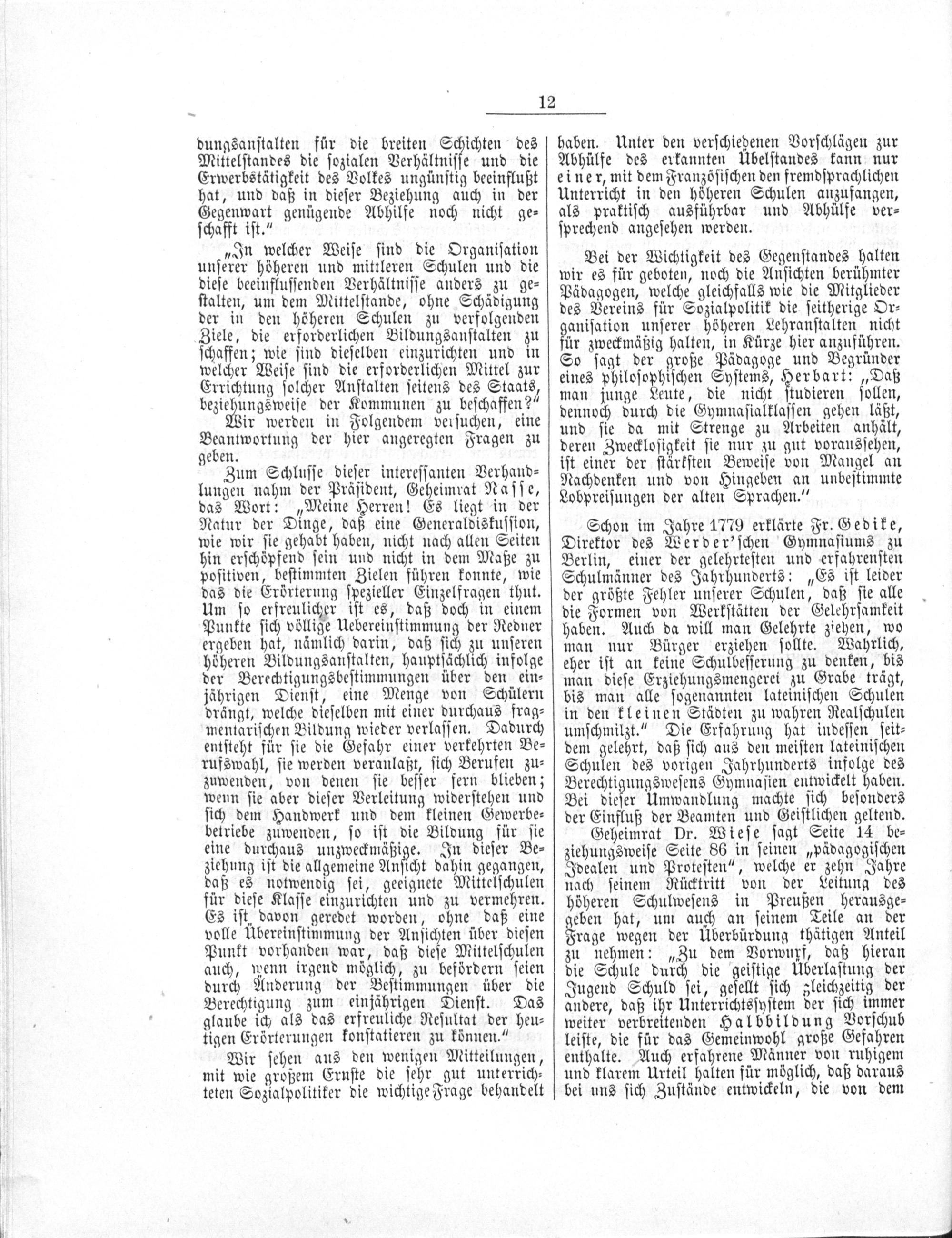 Zum Schluſſe dieſer intereſſanten Verhand⸗ lungen nahm der Präſident, Geheimrat Naſſe, das Wort:„Meine Herren! Es liegt in der Natur der Dinge, daß eine Generaldiskuſſion, wie wir ſie gehabt haben, nicht nach allen Seiten hin erſchöpfend ſein und nicht in dem Maße zu poſitiven, beſtimmten Zielen führen konnte, wie das die Erörterung ſpezieller Einzelfragen thut. Um ſo erfreulicher iſt es, daß doch in einem Punkte ſich völlige Uebereinſtimmung der Redner ergeben hat, nämlich darin, daß ſich zu unſeren höheren Bildungsanſtalten, hauptſächlich infolge der Berechtigungsbeſtimmungen über den ein⸗ jährigen Dienſt, eine Menge von Schülern drängt, welche dieſelben mit einer durchaus frag⸗ mentariſchen Bildung wieder verlaſſen. Dadurch entſteht für ſie die Gefahr einer verkehrten Be⸗ rufswahl, ſie werden veranlaßt, ſich Berufen zu⸗ zuwenden, von denen ſie beſſer fern blieben; wenn ſie aber dieſer Verleitung widerſtehen und ſich dem Handwerk und dem kleinen Gewerbe⸗ betriebe zuwenden, ſo iſt die Bildung für ſie eine durchaus unzweckmäßige. In dieſer Be⸗ ziehung iſt die allgemeine Anſicht dahin gegangen, daß es notwendig ſei, geeignete Mittelſchulen für dieſe Klaſſe einzurichten und zu vermehren. Es iſt davon geredet worden, ohne daß eine volle Übereinſtimmung der Anſichten über dieſen Punkt vorhanden war, daß dieſe Mittelſchulen auch, wenn irgend möglich, zu befördern ſeien durch Anderung der Beſtimmungen über die Berechtigung zum einjährigen Dienſt. Das glaube ich als das erfreuliche Reſultat der heu⸗ tigen Erörterungen konſtatieren zu können.“