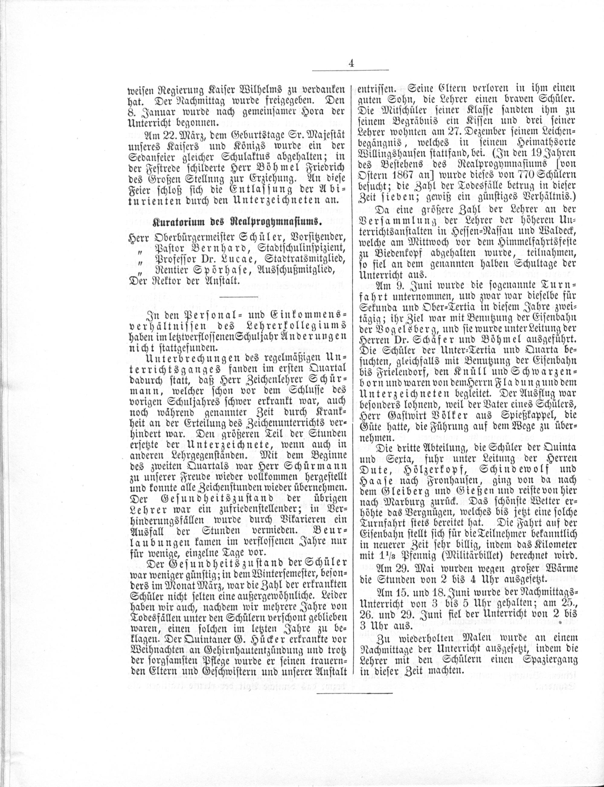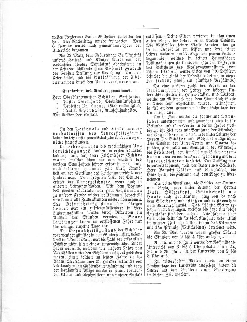 entriſſen. Seine Eltern verloren in ihm einen guten Sohn, die Lehrer einen braven Schüler. Die Mitſchüler ſeiner Klaſſe ſandten ihm zu ſeinem Begräbnis ein Kiſſen und drei ſeiner Lehrer wohnten am 27. Dezember ſeinem Leichen⸗ begängnis, welches in ſeinem Heimathsorte Willingshauſen ſtattfand, bei.(In den 19 Jahren des Beſtehens des Realprogymnaſiums[von Oſtern 1867 an] wurde dieſes von 770 Schülern beſucht; die Zahl der Todesfälle betrug in dieſer Zeit ſieven; gewiß ein günſtiges Verhältnis.)