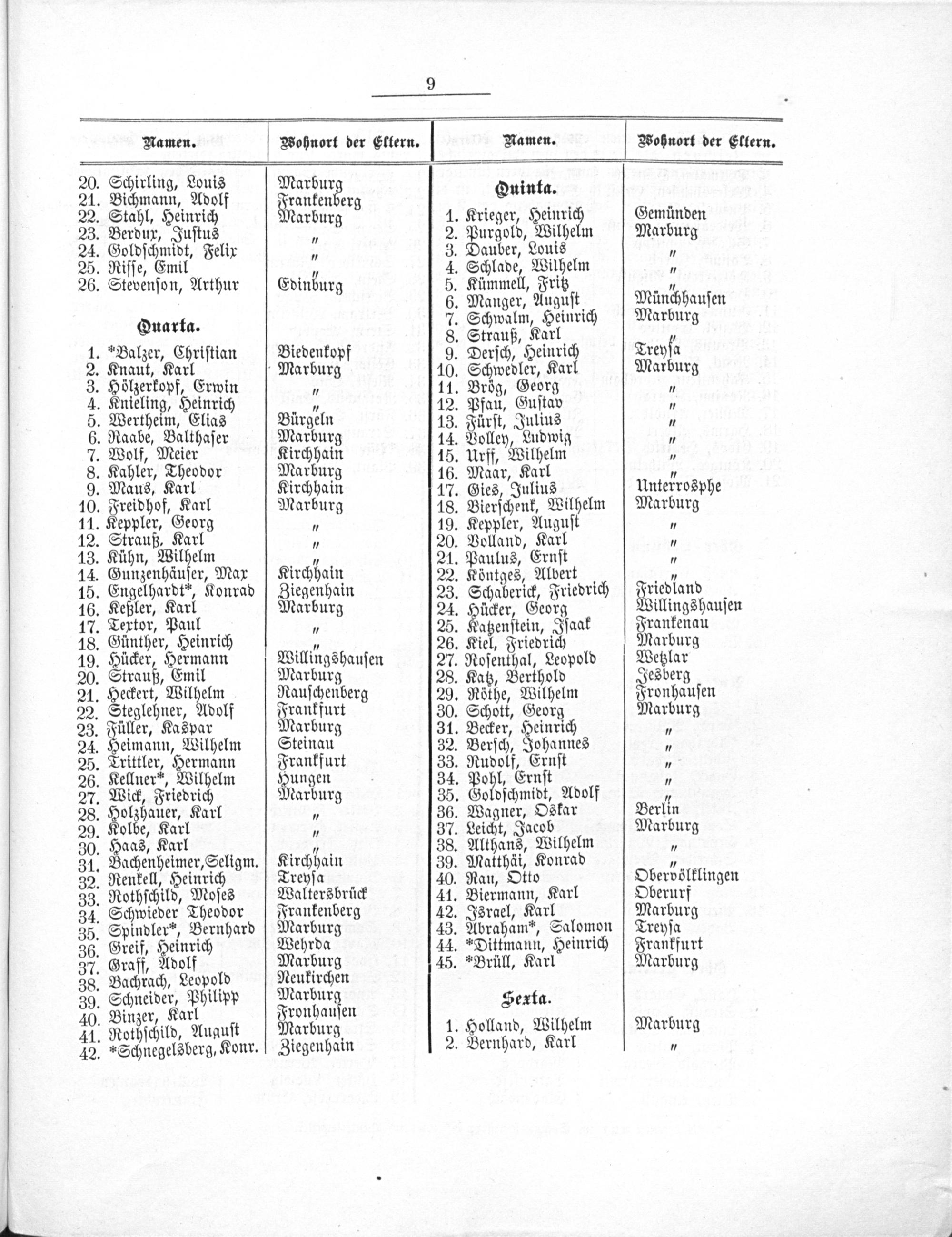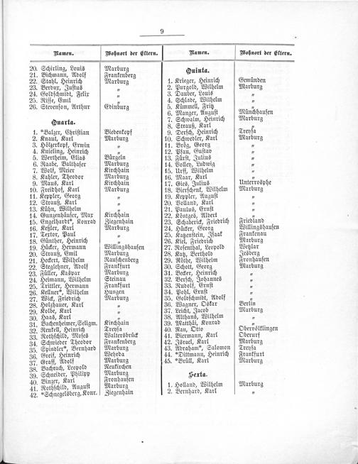 Namen. Zohnort der Ektern. RNamen. Wohnort der Eltern. 20. Schirling, Louis Marbur 21. Bichmann, Adolf Neanten erg Quinta.. 22. Stahl, Heinrich arburg 1. Krieger, Heinrich Gemünden 23. Berdux, Juſtus 7 2. Purgold, Wilhelm Marburg 24. Goldſchmidt, Felix„ 3. Dauber, Louis. 25. Riſſe, Emil„ 4. Schlade, Wilhelm 5 26. Stevenſon, Arthur Edinburg 5. Kümmell, Fritz„ 6. Manger, Auguſ eihchteulen 7. Schwalm, Heinri arburg Suarta. 5. Swauß, Karl— 1.»Balzer, Chriſtean Biedenkopf 9. Derſch, Heinrich Treyſa 2. Knaut, Karl Marburg 10. Schwedler, Karl Marburg 3. Hölzerkopf, Erwin.„ 11. Brög, Georg„ 4. Knieling, Heinrich„ 12. Pfau, Guſtav„ 5. Wertheim, Elias Bürgeln 13. Fürſt, Julius„ 6. Raabe, Balthaſer Marburg 14. Volley, Ludwig„ 7. Wolf, Meier Kirchhain 15. Urff, Wilhelm„ 8. Kahler, Theodor Marburg 16. Maar, Karl„ 9. Maus, Karl Kirchhain 17. Gies, Julius Unterrosphe 10. Freidhof, Karl Marburg 18. Bierſchenk, Wilhelm Marburg 11. Keppler, Georg„ 19. Keppler, Auguſt„ 12. Strauß, Karl„ 20. Volland, Karl„ 13. Kühn, vöilöein„ 21. Paulus, Ernſt„ 14. Gunzenhäuſer, Max Kirchhain 22. Köntges, Albert.„ 15. Engelhardt“, Konrad Ziegenhain 23. Schaberick, Friedrich Frebaur 16. Keßler, Karl Marburg 24. Hücker, Georg illingshauſen 17. Textor, Paul„ 25. Katzenſtein, Iſaak Frankenau 18. Günther, Heinrich„ 26. Kiel, Friedrich Marburg 19. Hücker, Hermann Willingshauſen 27. Roſenthal, Leopold Wetzlar 20. Strauß, Emil Marburg 28. Katz, Berthold Jesberg 21. Heckert, Wilhelm Rauſchenberg 29. Röthe, Wilhelm Fronhauſen 22. Steglehner, Adolf Wranffugt 30. Schott, Georg Marburg 23. Füller, Kaspar Marburg 31. Becker, Heinrich. 24. Heimann, Wilhelm Steinau 32. Berſch, Johannes„ 25. Trittler, Hermann Frankfurt 33. Rudolf, Ernſt 7 26. Kellner“, Wilhelm Hungen 34. Pohl, Ernſt„ 27. Wick, Friedrich Marburg 35. Goldſchmidt, Adolf„ 28. Holzhauer, Karl„ 36. Wagner, Oskar Berlin 29. Kolbe, Karl„ 37. Leicht, Jacob Marburg 30. Haas, Karl„ 38. Althans, Wilhelm„ 31. Bachenheimer, Seligm. Kirchhain 39. Matthäi, Konrad„ 32. Renkell, Heinrich Treyſa 40. Rau, Otto Obervölklingen 33. Rothſchild, Moſes Waltersbrück 41. Biermann, Karl Oberurf 34. Schwieder Theodor Frankenberg 42. Israel, Karl Marburg 35. Spindler“, Bernhard Marburg 43. Abraham“, Salomon Treyſa 36. Greif, Heinrich Wehrda 44.*Dittmann, Heinrich Frankfurt 37. Graff, Adolf Marburg 45.*Brüll, Karl Marburg 38. Bachrach, Leopold Neukirchen 39. Schneider, Philipp Marhai Sexta. 40. Binzer, Karl Fronhauſen itbel Marb 41. Rothſchild, Auauſt Marburg 1. Holland, Wilhelm arburg 42.»Schnegelsberg, Konr. Ziegenhain 2. Bernhard, Karl„