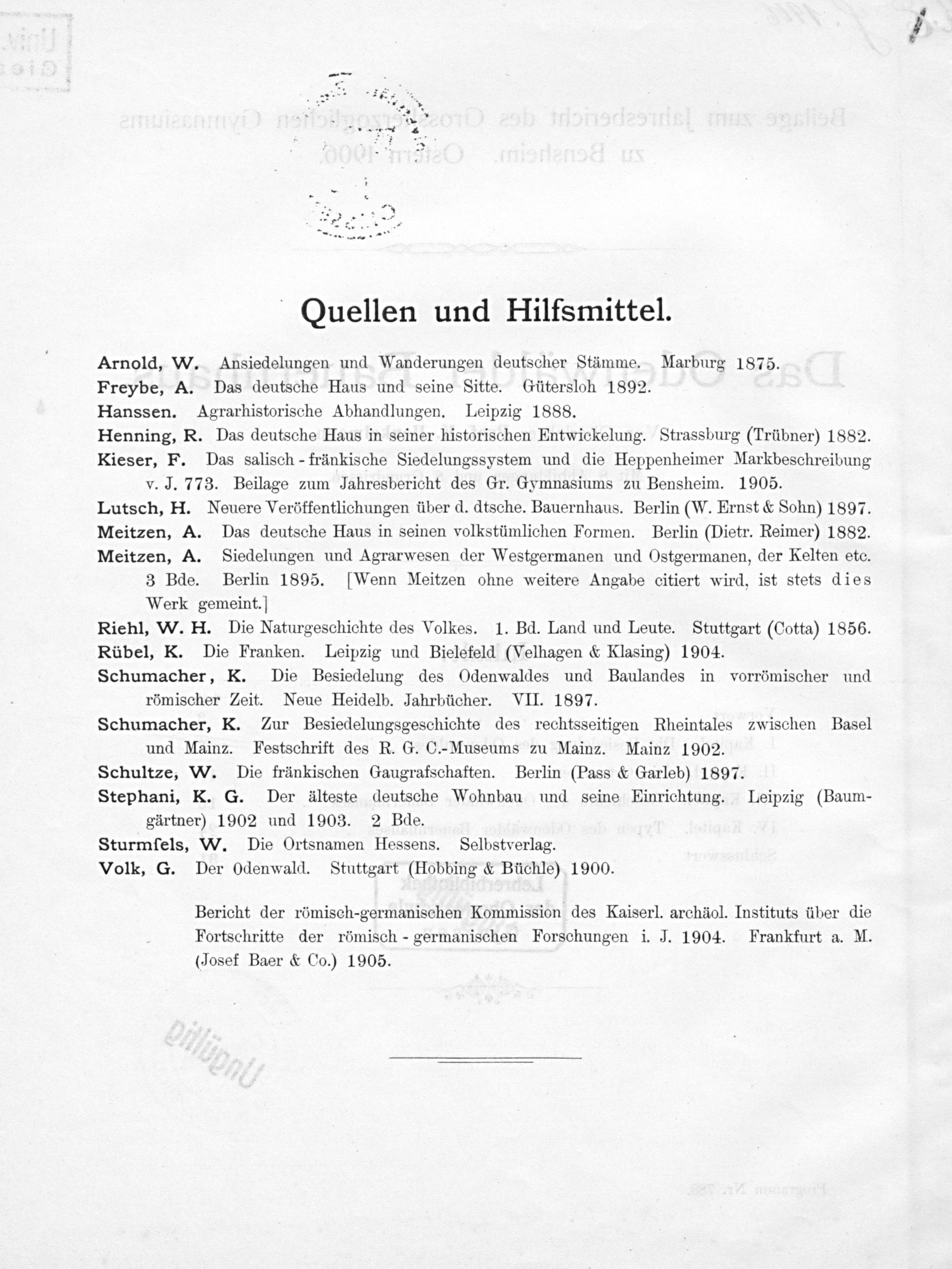 Kieser, F. Das salisch-fränkische Siedelungssystem und die Heppenheimer Markbeschreibung v. J. 773. Beilage zum Jahresbericht des Gr. Gymnasiums zu Bensheim. 1905.