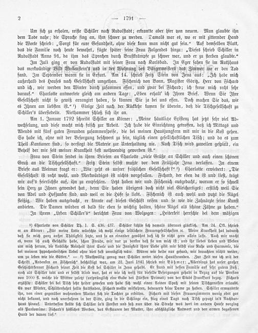 Im Juli ging er von Rudolſtadt mit ſeiner Frau nach Karlsbad. In Eger ſahen ſie im Rathhaus das merkwürdige Bild Wallenſtein's und in der Wohnung des Bürgermeiſters das Zimmer wo er den Tod fand. Im September waren ſie in Erfurt. Am 14. ſchrieb Fritz Stein von Jena aus:„Ich habe mich außerhalb des Hauſes nach Geſellſchaft umgethan. Fiſchenich von Bonn, Magiſter Göritz, Herr von Fichard und ich, wir werden den Winter durch zuſammen eſſen, und zwar bei Fichard; ich freue mich recht ſehr darauf.“ Charlotte antwortete gleich am andern Tage:„Eben erhalt' ich Ihren Brief. Wenn Sie Ihre Geſellſchaft nicht ſo gewiß arrangirt haben, ſo können Sie ja bei uns eſſen. Doch machen Sie das, wie es Ihnen am liebſten iſt.“ ¹) Einige Zeit nach der Rückkehr kamen ſie überein, daß die Tiſchgeſellſchaft zu Schiller's überſiedelte. Niethammer ſchloß ſich ihr an.