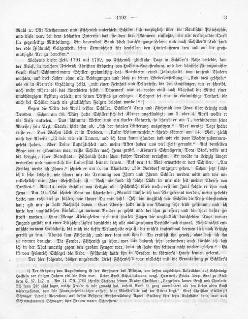Während dieſer Zeit, 1791 auf 1792, wo Fiſchenich glückliche Tage in Schiller's Nähe verlebte, kam der Brief, in welchem Friedrich Chriſtian Erbprinz von Holſtein⸗Auguſtenburg und der däniſche Finanzminiſter Ernſt Graf Schimmelmann Schiller großmüthig das Anerbieten eines Jahrgehalts von tauſend Thalern machten, auf drei Jahre ohne alle Bedingungen und bloß zu ſeiner Wiederherſtellung.„Und dies geſchah,“ wie es in Körner's Erzählung heißt,„mit einer Feinheit und Delicateſſe, die den Empfänger, wie er ſchreibt, noch mehr rührte als das Anerbieten ſelbſt. Dänemark war es, woher einſt auch Klopſtock die Mittel einer unabhängigen Exiſtenz erhielt, um ſeinen Meſſias zu endigen. Geſegnet ſei eine ſo edelmüthige Denkart, die auch bei Schiller durch die glücklichſten Folgen belohnt wurde!“*²)