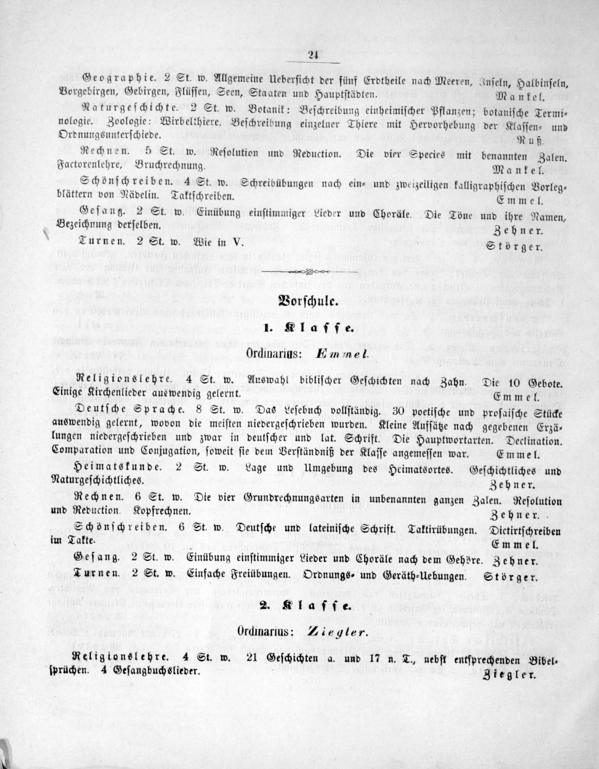 Ordnungsunterſchiede. Ruß. Rechnen. 5 St. w. Reſolution und Reduction. Die vier Species mit benannten Zalen. Factorenlehre, Bruchrechnung. Mankel. Schönſchreiben. 4 St. w. Schreibübungen nach ein⸗ und zweizeiligen kalligraphiſchen Vorleg⸗ blättern von Nädelin. Taktſchreiben. Emmel. Geſang. 2 St. w. Einübung einſtimmiger Lieder und Choräle. Die Töne und ihre Namen, Bezeichnung derſelben. Zehner. Turnen. 2 St. w. Wie in V. Störger. ˖——— Vorſchule. 1. Klaſſe.