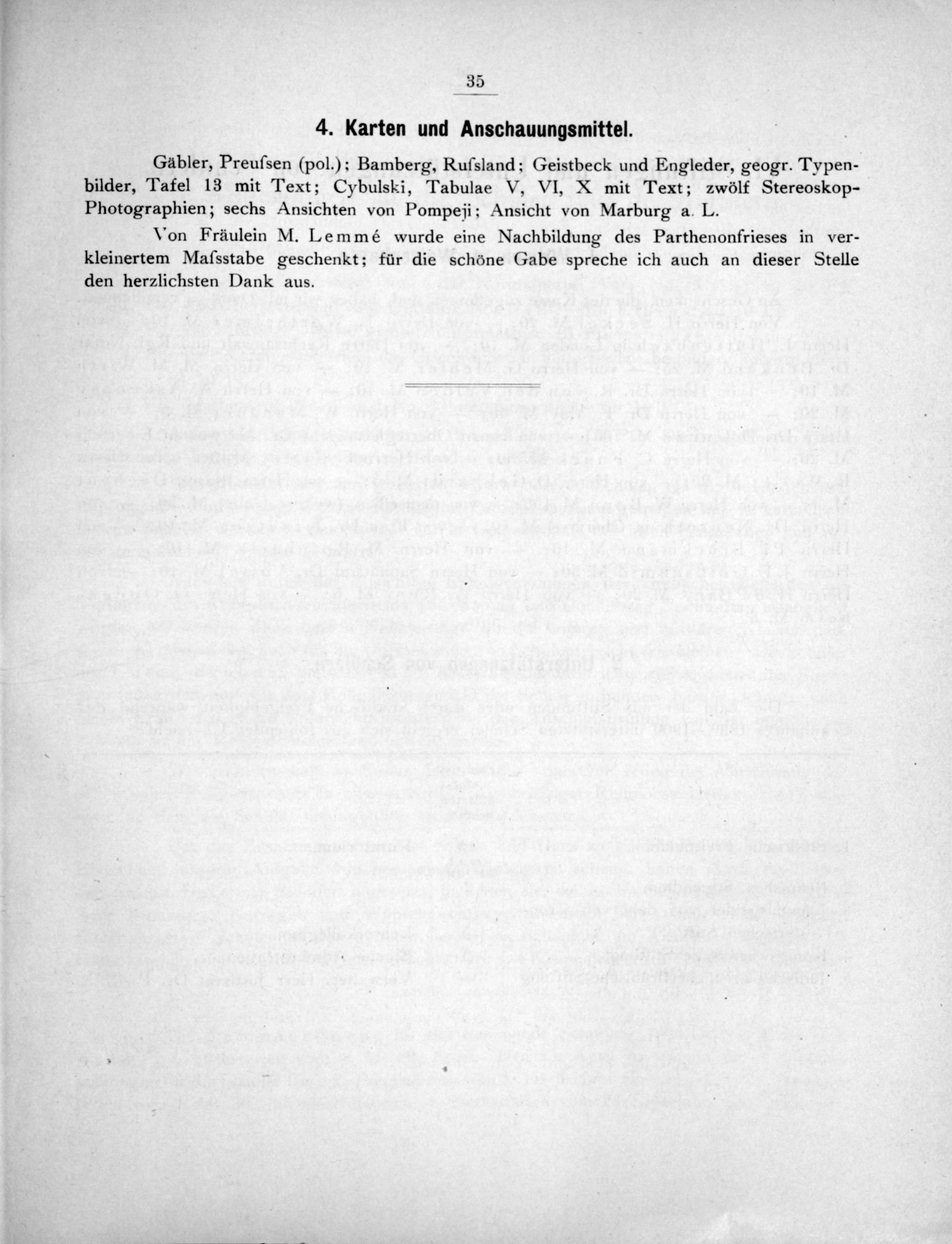 Gdâbler, Preuſsen(pol.); Bamberg, Rufsland; Geistbeck und Engleder, geogr. Typen- bilder, Tafel 13 mit Text; Cybulski, Tabulae V, VI, X mit Text; zwoölf Stereoskop- Photographien; sechs Ansichten von Pompeji; Ansicht von Marburg a. L.