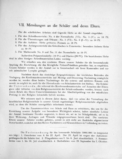 VII. Müitteilungen an die Schüler und deren Eltern.