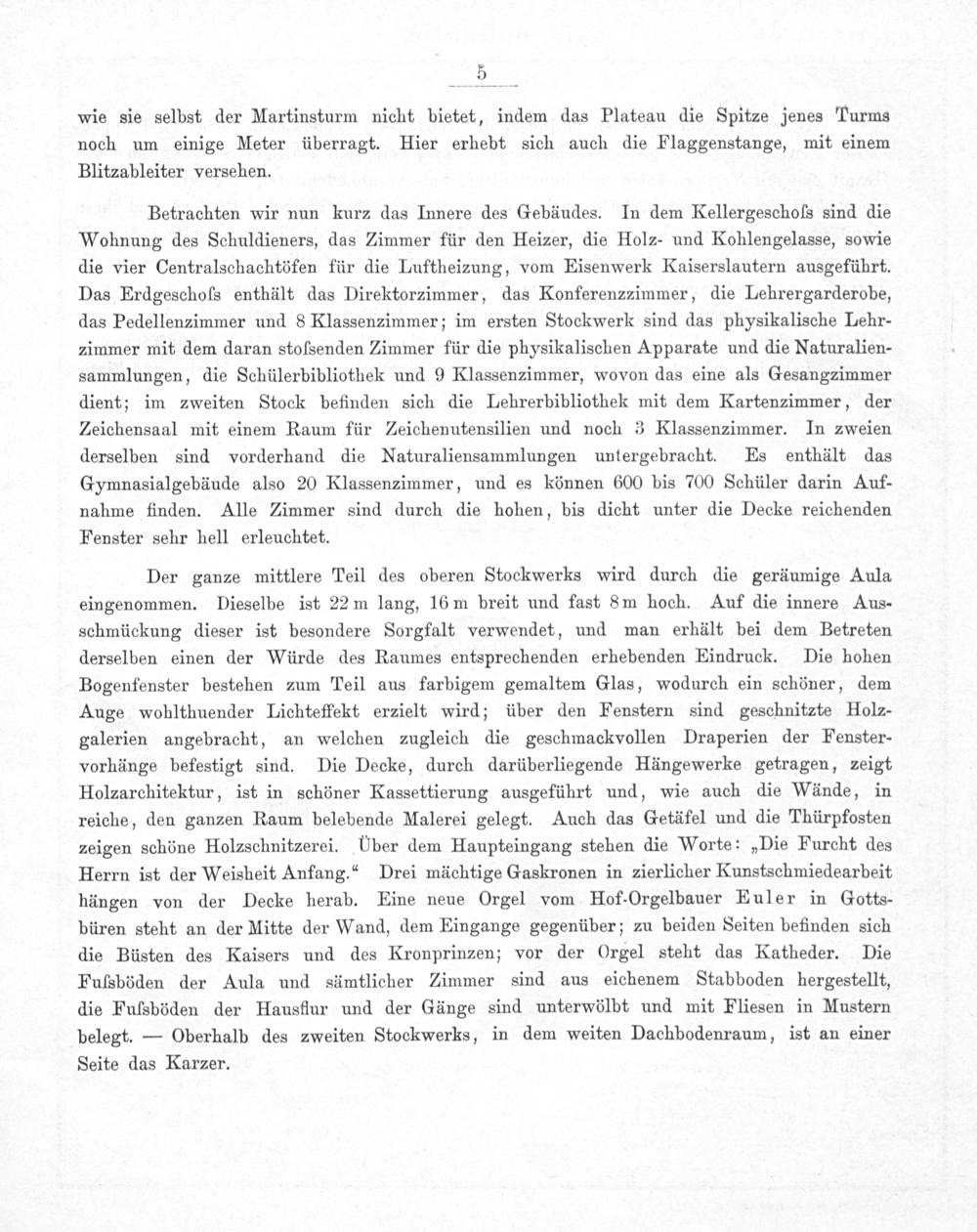 Der ganze mittlere Teil des oberen Stockwerks wird durch die geräumige Aula eingenommen. Dieselbe ist 22 m lang, 16 m breit und fast 8m hoch. Auf die innere Aus- schmückung dieser ist besondere Sorgfalt verwendet, und man erhält bei dem Betreten derselben einen der Würde des Raumes entsprechenden erhebenden Eindruck. Die hohen Bogenfenster bestehen zum Teil aus farbigem gemaltem Glas, wodurch ein schöner, dem Auge wohlthuender Lichteffekt erzielt wird; über den Fenstern sind geschnitzte Holz- galerien angebracht, an welchen zugleich die geschmackvollen Draperien der Fenster- vorhänge befestigt sind. Die Decke, durch darüberliegende Hängewerke getragen, zeigt Holzarchitektur, ist in schöner Kassettierung ausgeführt und, wie auch die Wände, in reiche, den ganzen Raum belebende Malerei gelegt. Auch das Getäfel und die Thürpfosten zeigen schöne Holzschnitzerei. UÜber dem Haupteingang stehen die Worte:„Die Furcht des Herrn ist der Weisheit Anfang.“ Drei mächtige Gaskronen in zierlicher Kunstschmiedearbeit hängen von der Decke herab. Eine neue Orgel vom Hof-Orgelbauer Euler in Gotts- büren steht an der Mitte der Wand, dem Eingange gegenüber; zu beiden Seiten befinden sich die Büsten des Kaisers und des Kronprinzen; vor der Orgel steht das Katheder. Die Fulſsböden der Aula und sämtlicher Zimmer sind aus eichenem Stabboden hergestellt, die Fufsböden der Hausflur und der Gänge sind unterwölbt und mit Fliesen in Mustern belegt.— Oberhalb des zweiten Stockwerks, in dem weiten Dachbodenraum, ist an einer