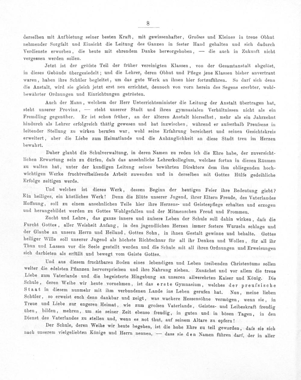 Und aus diesem fruchtbaren Boden eines lebendigen und Leben treibenden Christentums sollen weiter die edelsten Pflanzen hervorsprielsen und ihre Nahrung ziehen. Zunächst und vor allem die treue Liebe zum Vaterlande und die begeisterte Hingebung an unseren allverehrten Kaiser und König. Die Schule, deren Weihe wir heute vornehmen, ist das erste Gymnasium, welches der preufsische Staat in diesem nunmehr mit ihm verbundenen Lande ins Leben gerufen hat. Nun, meine lieben Schüler, so erweist euch denn dankbar und zeigt, was wackere Hessensöhne vermögen, wenn sie, in